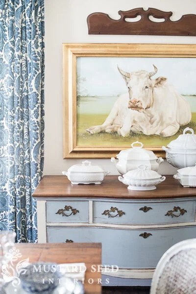 The name and color inspiration came from this P. Kaufmann fabric Miss Mustard Seed used in her home when she lived in Pennsylvania. The name of the pattern is “Artissimo”!