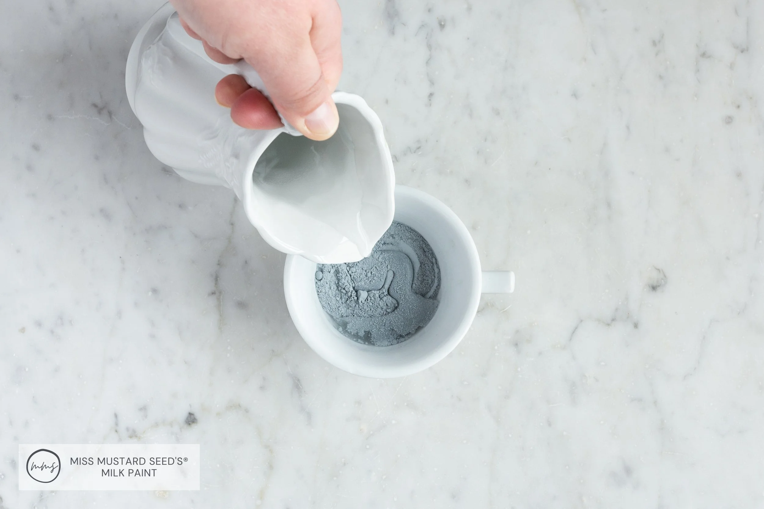 Next, add as many scoops of MilkPaint™ powder you’ll need for your project. Today, we’re using Bergere. (This smokey blue gray will be available at your local retailer next week!)