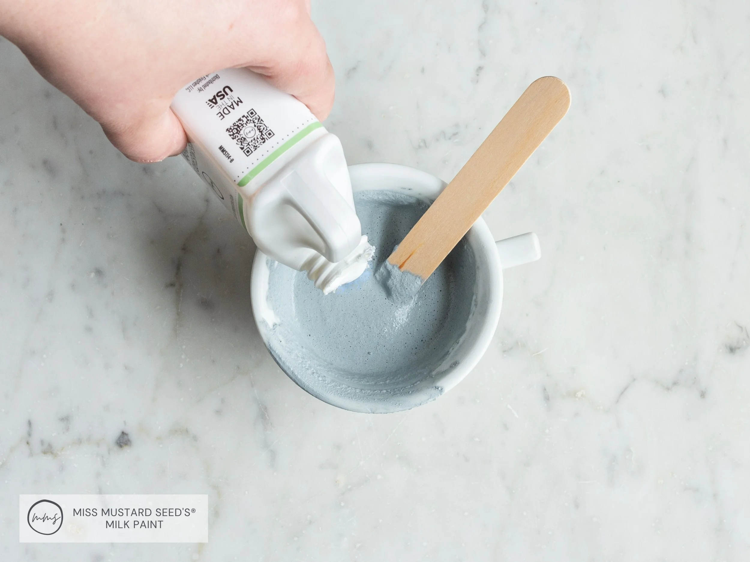 Add in 1 part MilkGrip™ to 4 parts MilkPaint™, then stir to combine. (If you’re worried about adhesion, or you need extra insurance, use equal parts.)