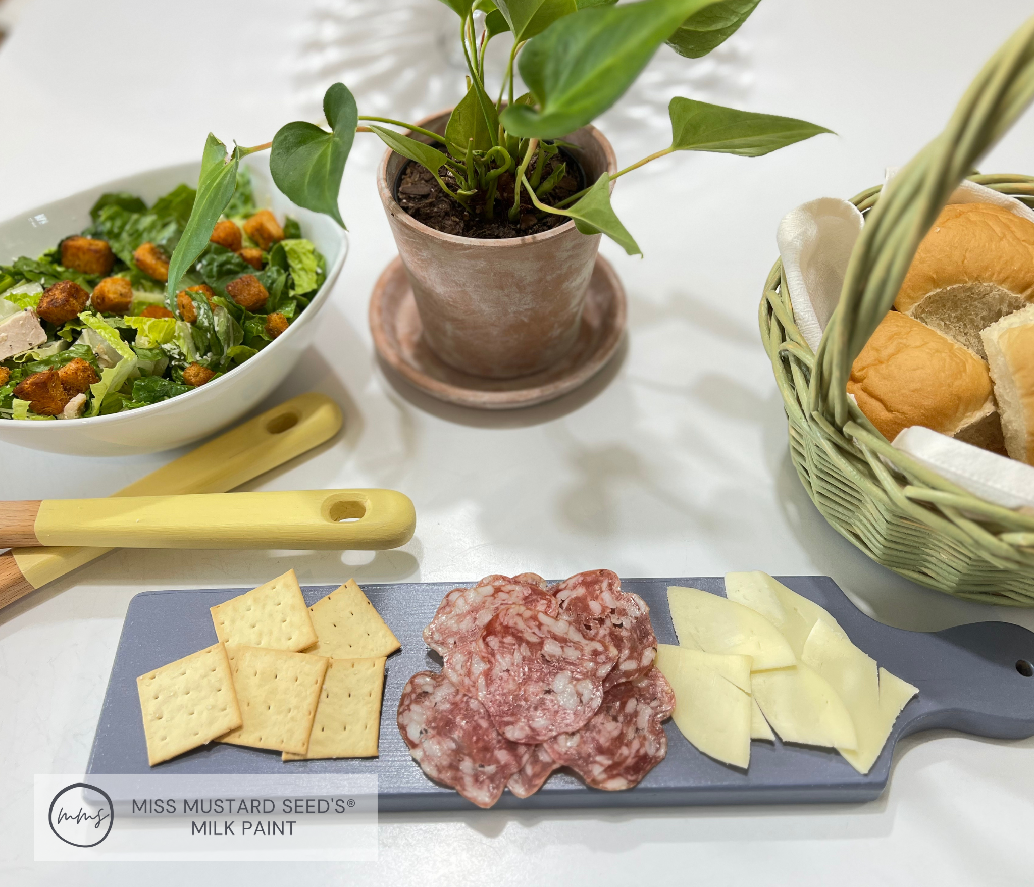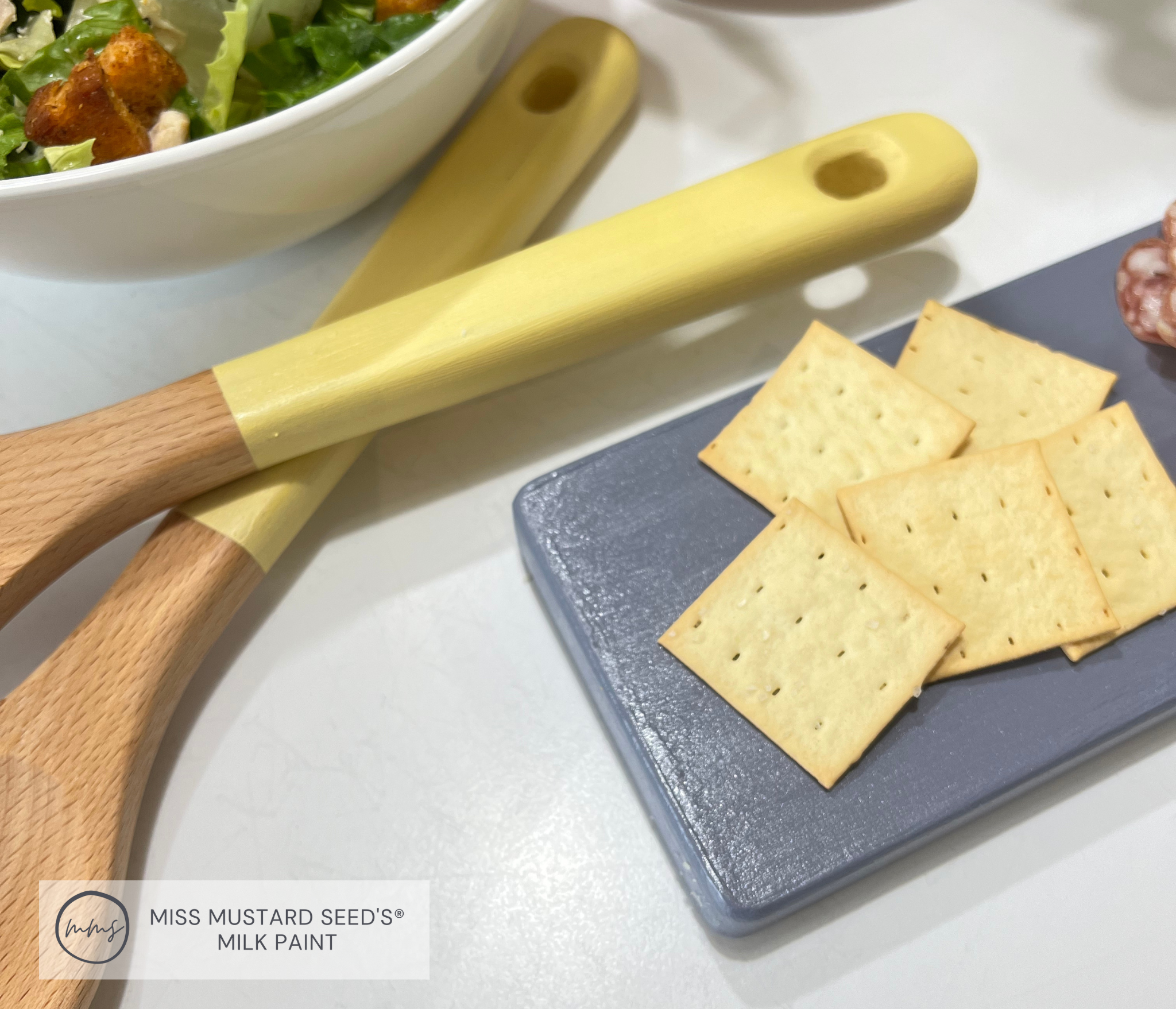 Next, we painted a wooden serving board in Dried Lavender for a soft pop of color. The board had a finish, and although we sanded, we noticed that our MilkPaint™ wasn’t sticking properly to the board… so what was causing this? It was the finish. Some modern finishes are meant to deter stains and prevent water absorption, making it difficult for MilkPaint™ to adhere. So we opted to remove the finish just like we did with the spoons and added MilkGrip™ to our paint to ensure proper adhesion.