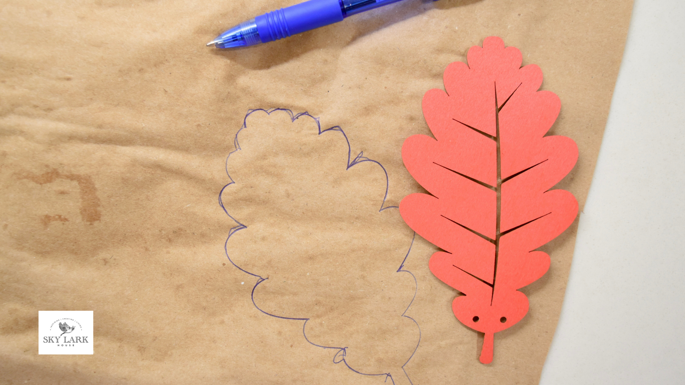 Using the backside of your painted paper and a wooden leaf template, trace the outline of the leaf onto the kraft paper.