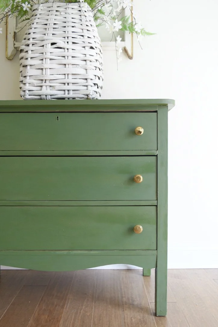 Nicole from Thirteen Hundred North painted this high boy dresser in Boxwood, stained the top and legs, and paired it with gold knobs. She paired this piece with greenery for a boho look.