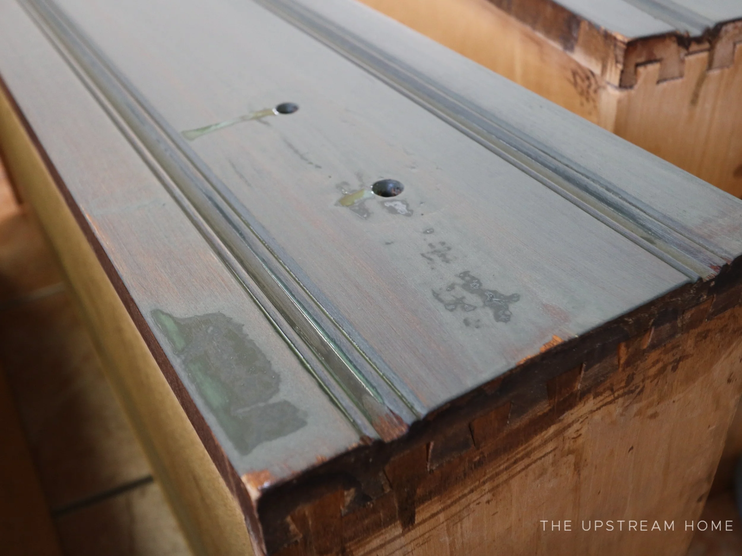 I decided to go for a two-tone look with this cabinet, leaving the top in its natural finish. To accomplish this look, I recommend using Krud Kutter to clean the top really well, rinse with water, and then apply Hemp Oil! This user-friendly product does a wonderful job of revitalizing dry wood.