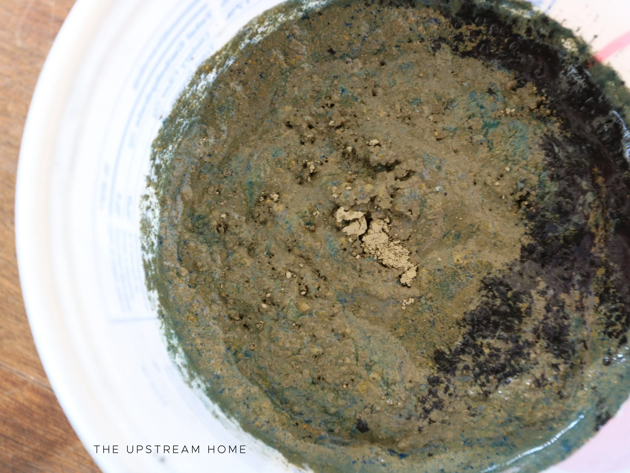 Miss Mustard Seed’s Milk Paint comes in a powder form, making it easy to store and helping to preserve the product. Simply measure out how much paint you’ll need, mix with water in a 1:1 ratio and add a few drops of MilkMix-EZ. For this cabinet, I used 2/3 cup of Boxwood, ⅓ cup of Typewriter, a cup of water, and 4 drops of MilkMix-EZ. Once you have it all together, go ahead and whisk to stir! After it’s stirred well, let it sit for about 10 mins, stir again, and you should be good to go!