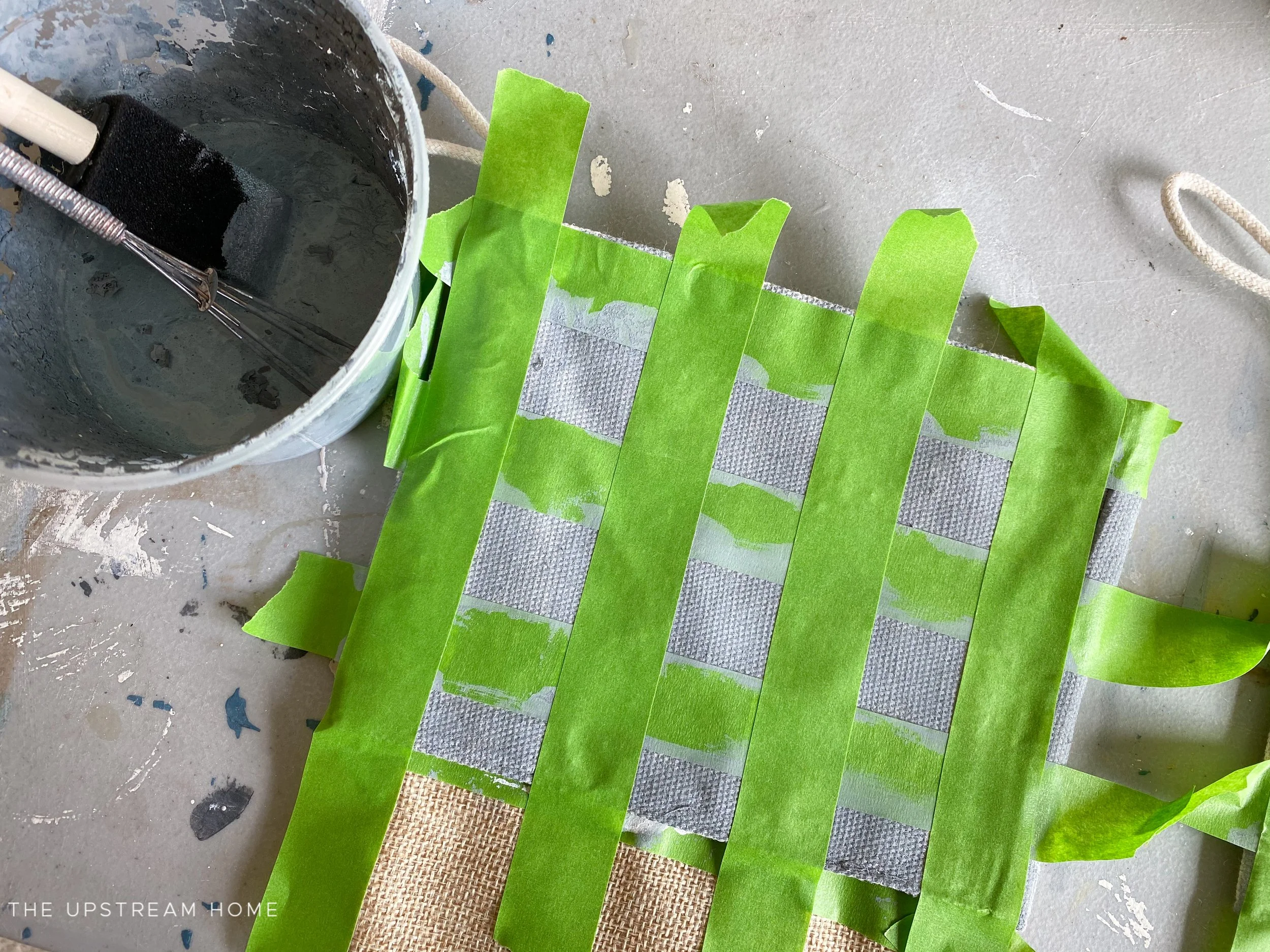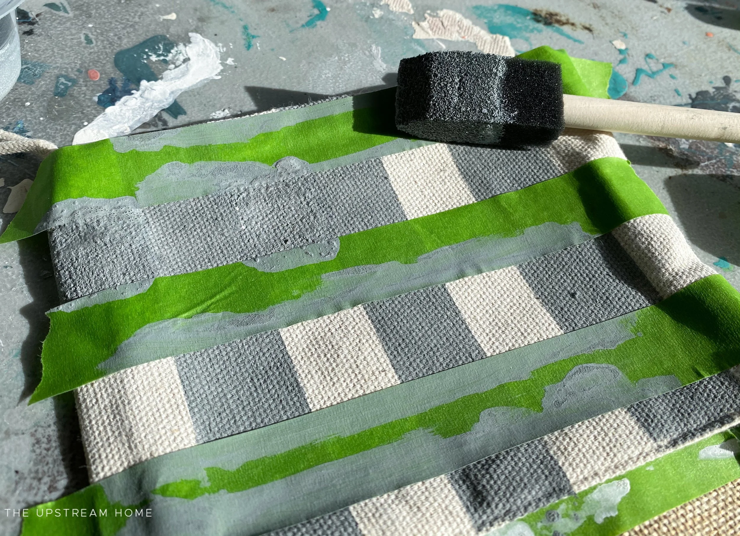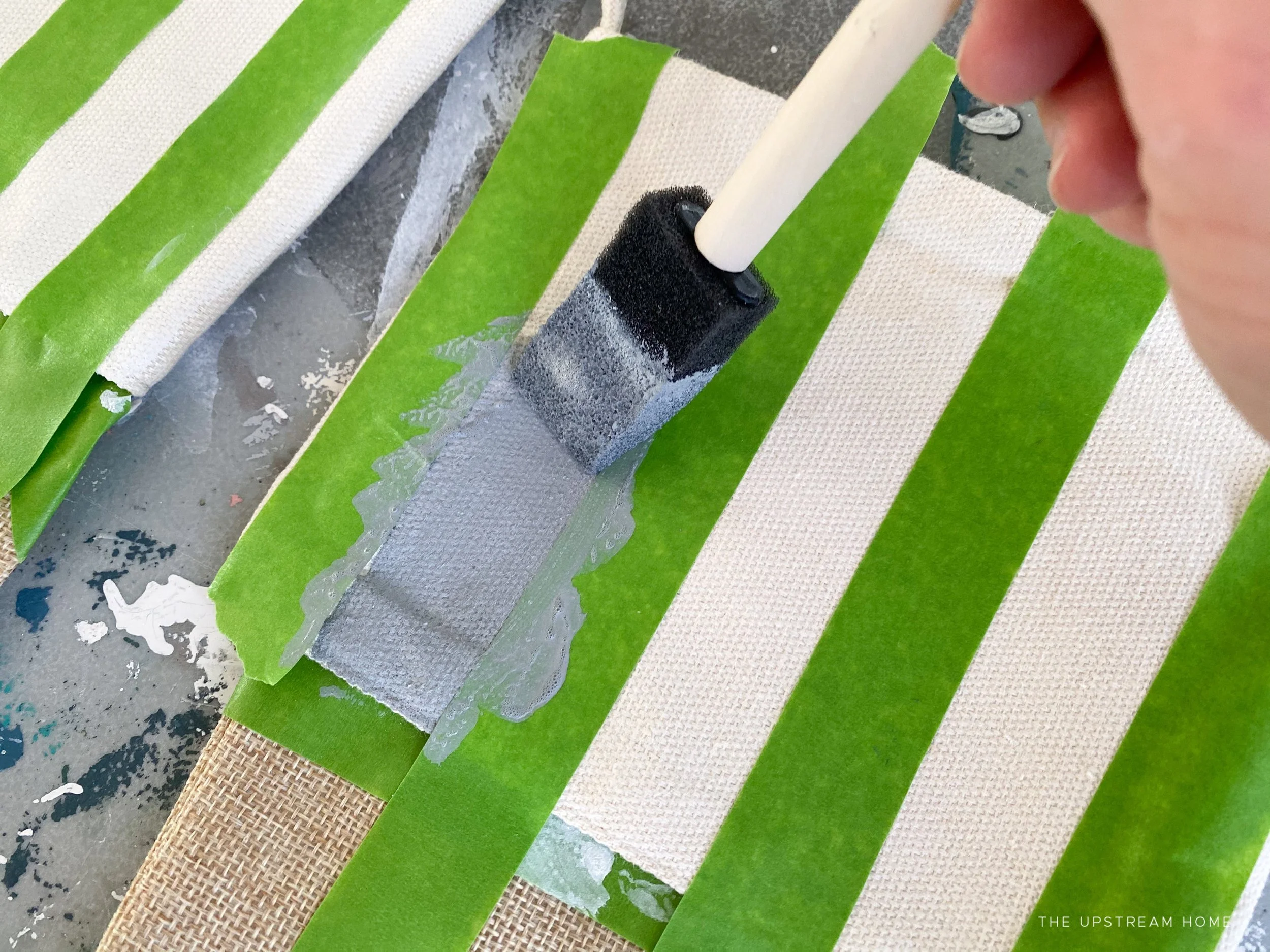 Using the 50/50 Ironstone + Aviary mix, paint the spaces between the tape, creating stripes. I found a near dry brush and a dabbing motion works well for this project. Again, I show this part of the project in my tutorial video.