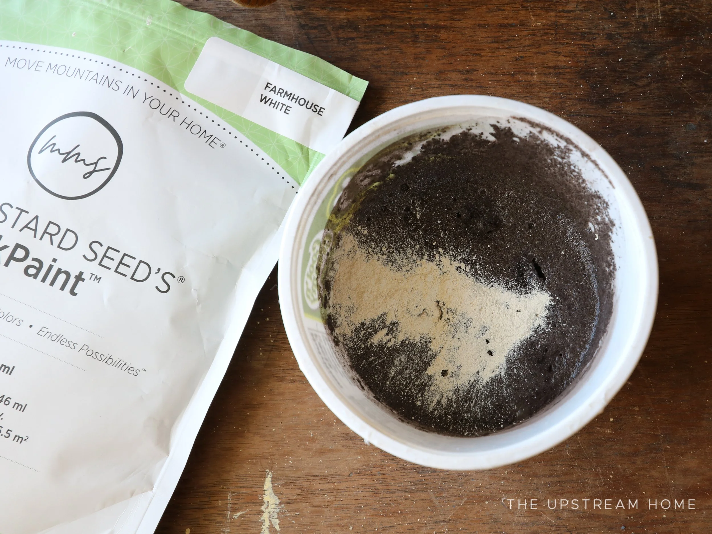 For this particular table, I was going for a little lighter stain, so I tried adding a bit of Farmhouse White to the Curio to lighten the stain. The recipe I used for this tabletop was 1 Tbsp Curio, 1 Tsp Farmhouse White, and 1/4c. Water. You can see when making a stain, your ratio of paint to water is much different than when mixing to paint!