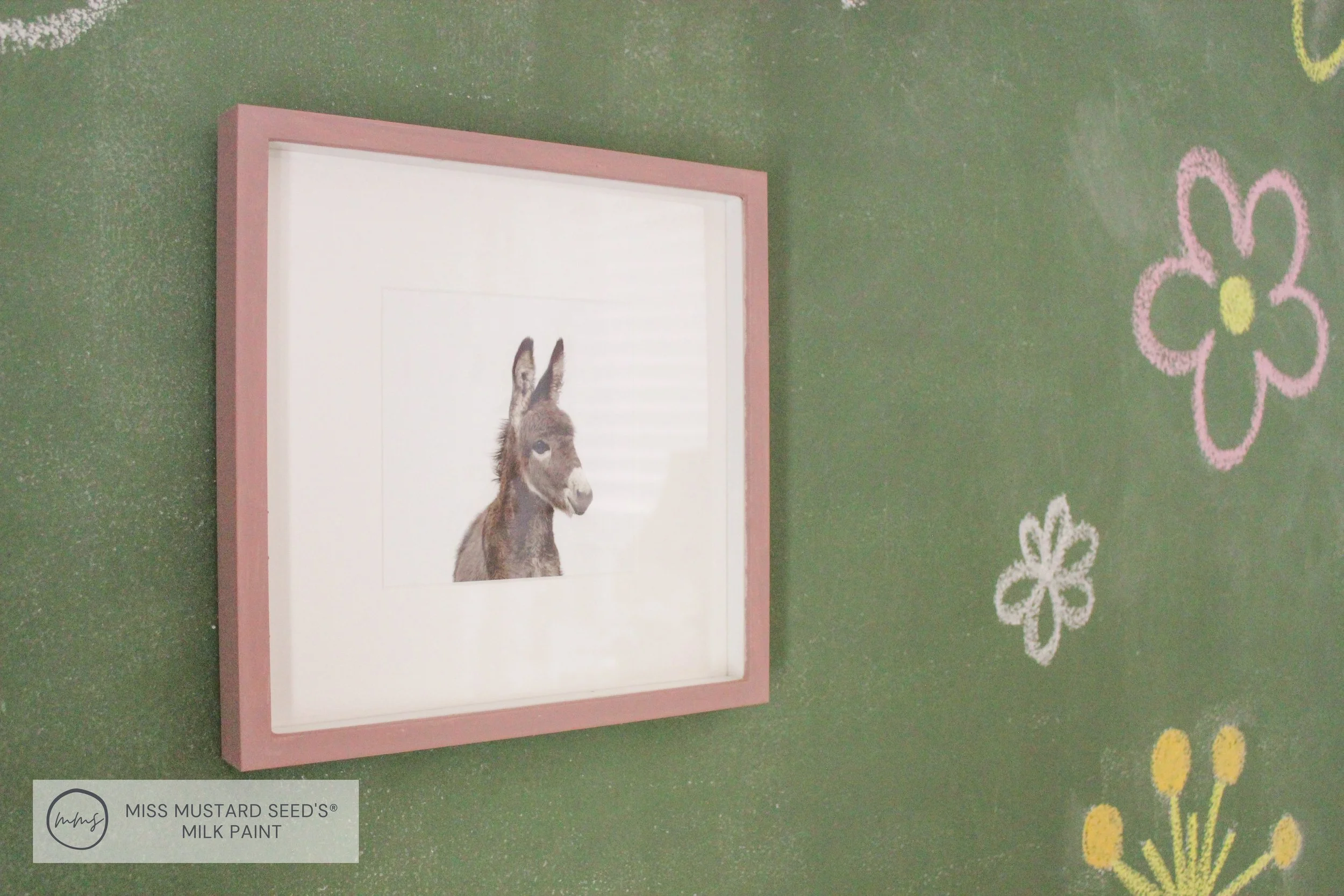 The wall was painted in a chalkboard mix of 3 parts Boxwood + 2 parts Ink Blue + Linen. Our MilkPaint™ can easily be rolled onto a wall for easy application! It will take 2-3 coats to achieve full coverage, and make sure you “season” the wall by rubbing chalk all over it and wiping it away. This will help prevent your designs from being burned into the surface.
