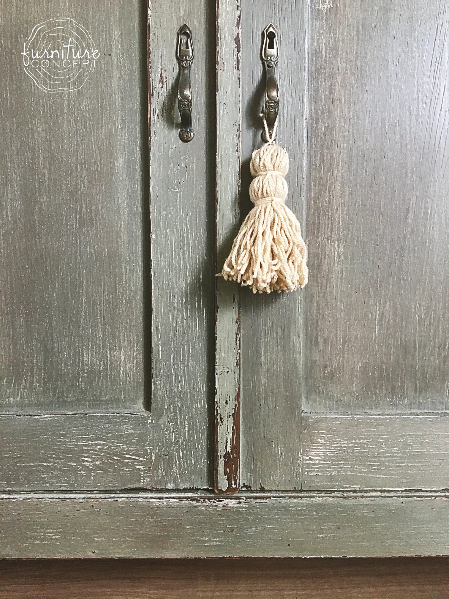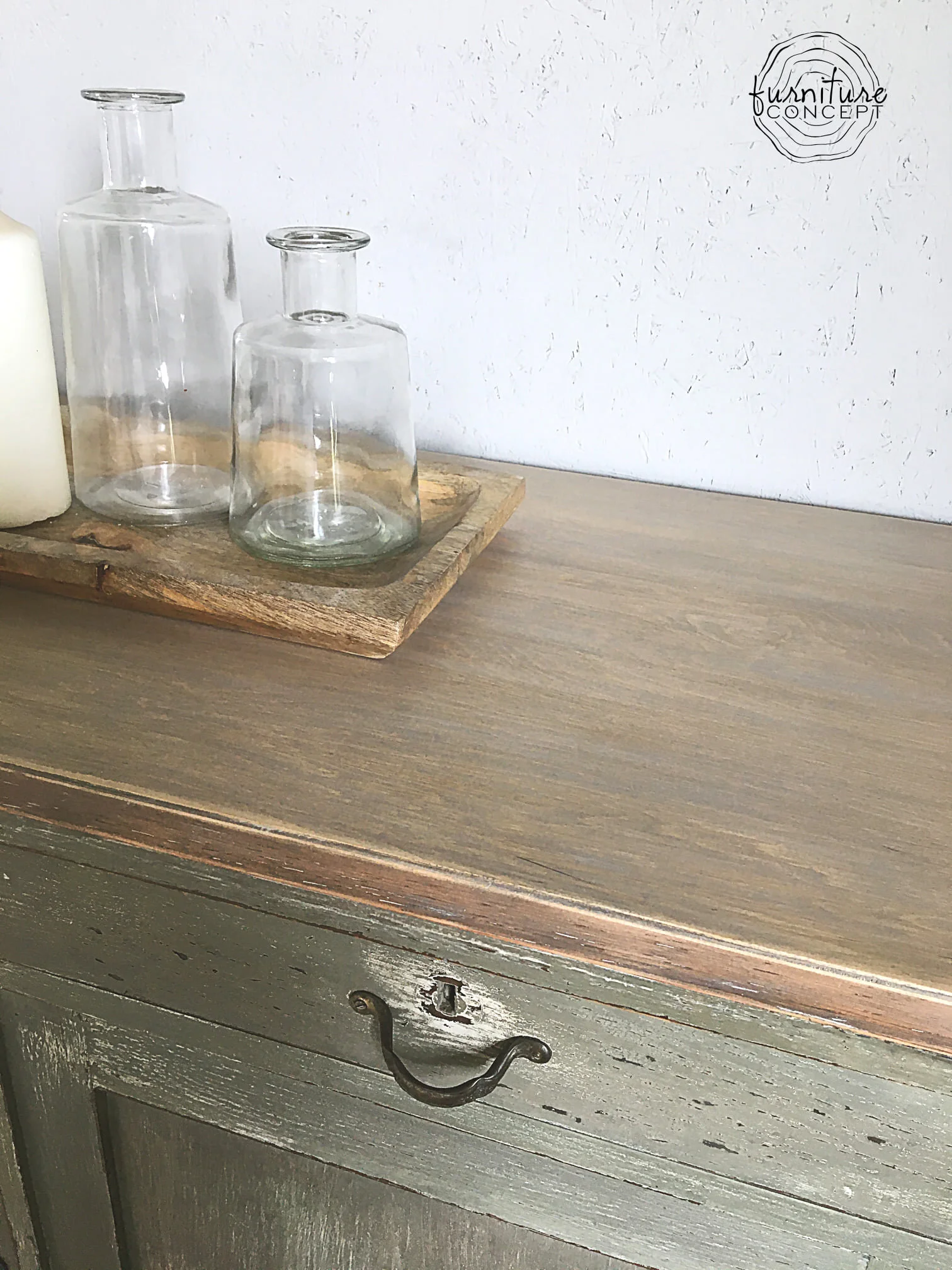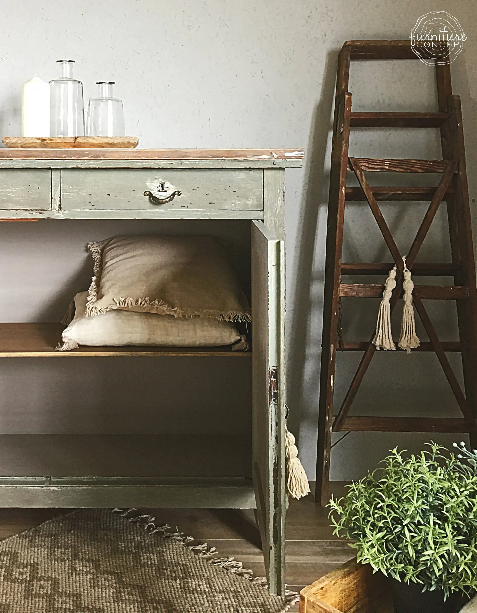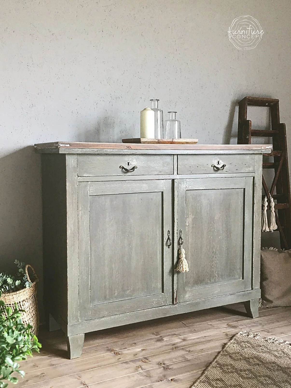 After Klaudia mixed up her custom sage green, she refinished this cabinet in her characteristic style - worn, aged and gorgeous!