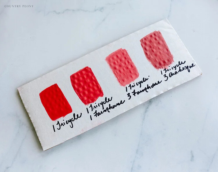In full disclosure, Emily tried using Arabesque, and it didn’t translate well on fabric. With that said, she used Pink Grapefruit and Tricycle, which worked out perfectly. Our Pink Grapefruit actually wound up looking a bit like the shade of Arabesque in the end!