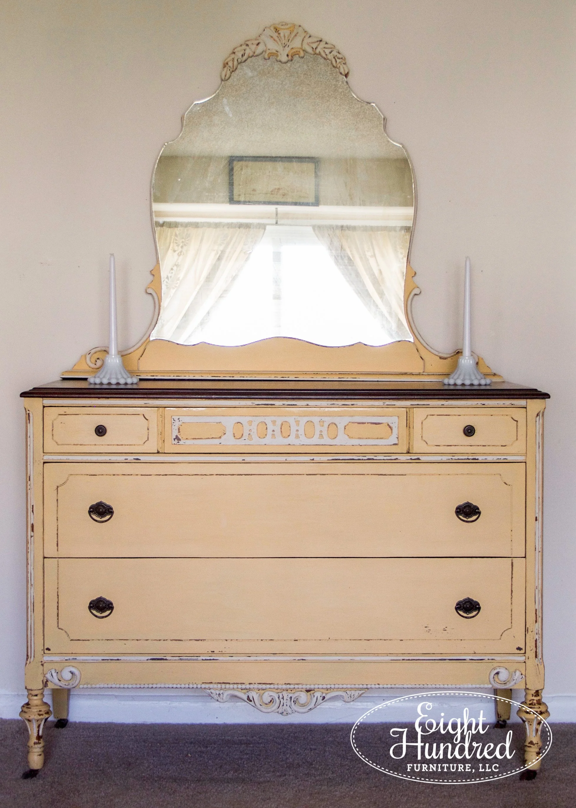 Horizontal depression-era dressers have the most beautiful mirrors! Their sweeping curves offer a nice juxtaposition of the boxy shape of the main body. Oftentimes, the glass is held in place by wooden accent pieces along the top and bottom.