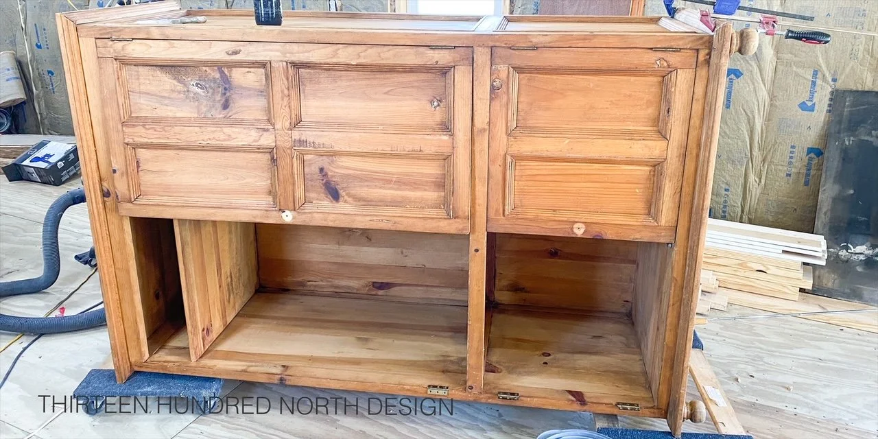 This large cabinet is by far the largest piece I have refinished to date; it is over 6ft tall and almost 4ft wide, so I had my work cut out for me. It belongs to a family member of mine, and she wanted to update the look. This piece will be used for storage in her newly designed and constructed home office. The original finish appears to be knotty alder, and the wood has a more rustic appearance. While she wanted to keep the character of the piece, she was also wanting it repaired and freshened up. She gave me creative freedom, and for the longest time, I was not sure what I wanted to do with it, so it sat in my shop until I found some inspiration. It truly had me stumped. I had never refinished this style of furniture or species of wood before.