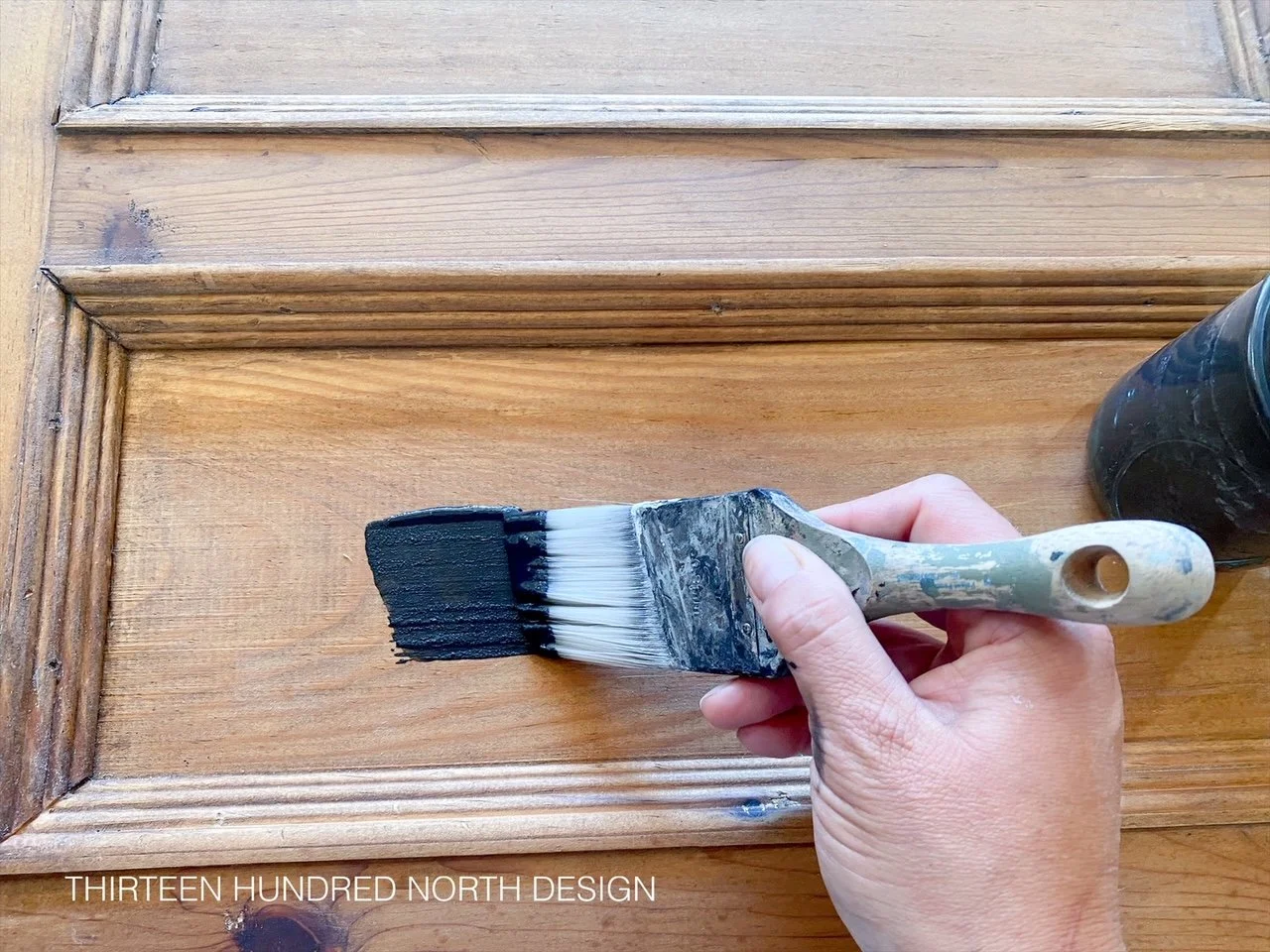 I knew black was the direction I was headed with this piece, but to paint a piece this size all black with no depth or color variation felt too heavy, and I was afraid the piece would feel cold. With the amount of surface space and all of the detailed molding, a blackwash was not a great option, but I still wanted a similar look. I decided to create a sort of reverse wash using a wet distress method. I wanted it to look perfectly worn and allow the warm wood tones to show through to add depth and character. Here is how I did it!