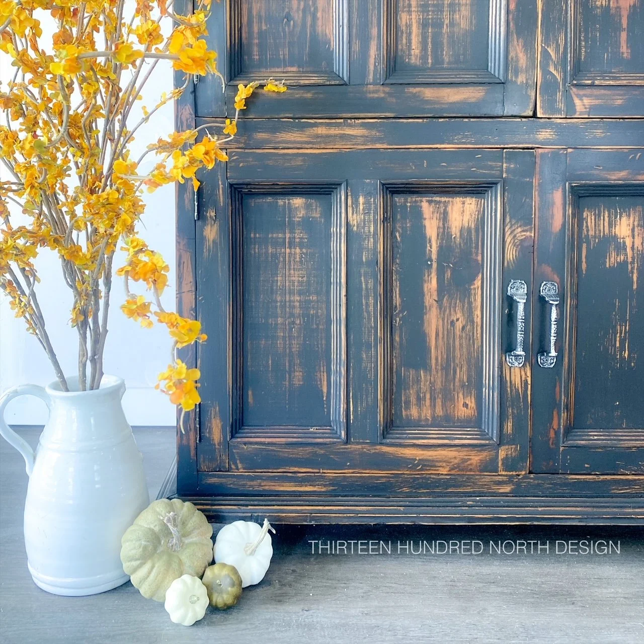 For staging with this piece, I kept it very simple. The cabinet is so large it took up most of my staging wall! I used a cream-colored heavy pitcher and filled it with some gorgeous fall stems, and placed a few pumpkins as the base of the pitcher. I draped a few muted ivy stems on top, and that was it! I wanted the photos to have a subtle touch of fall without taking on a Halloween vibe because of the black cabinet.