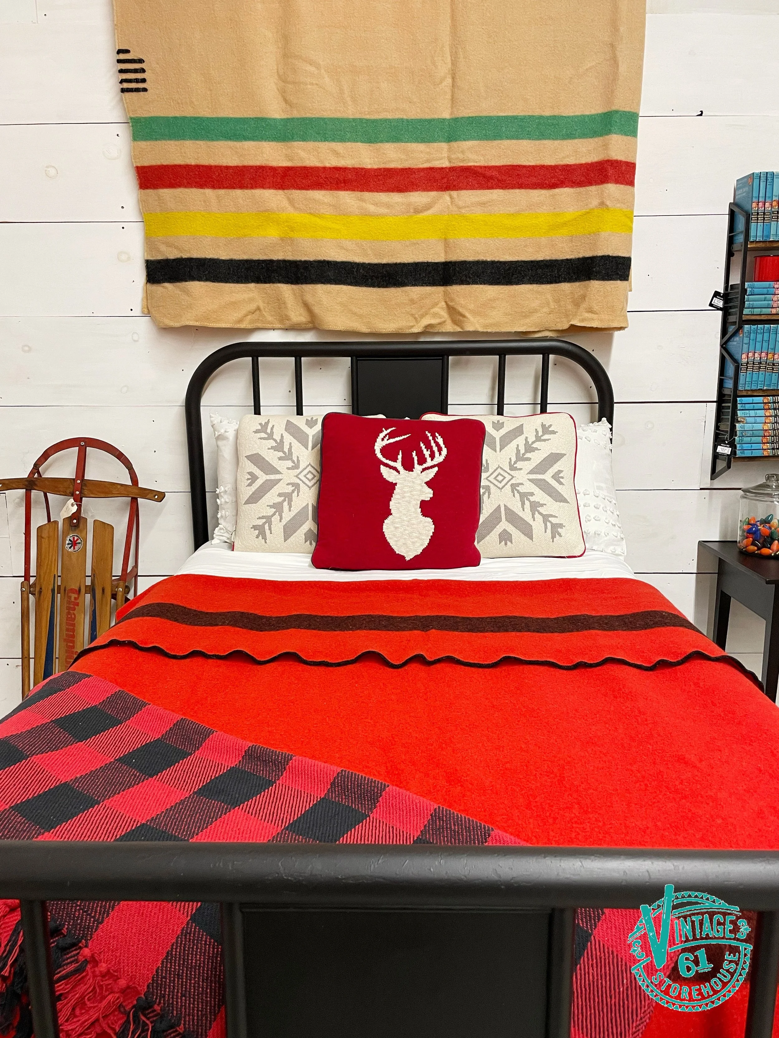 Miss Mustard Seed’s® Milk Paint is just what’s needed to pave that journey and pull everything together. At Vintage 61 Storehouse, we created a cozy guest room filled with warmth and color that was inspired by this Hudson Bay Blanket.
