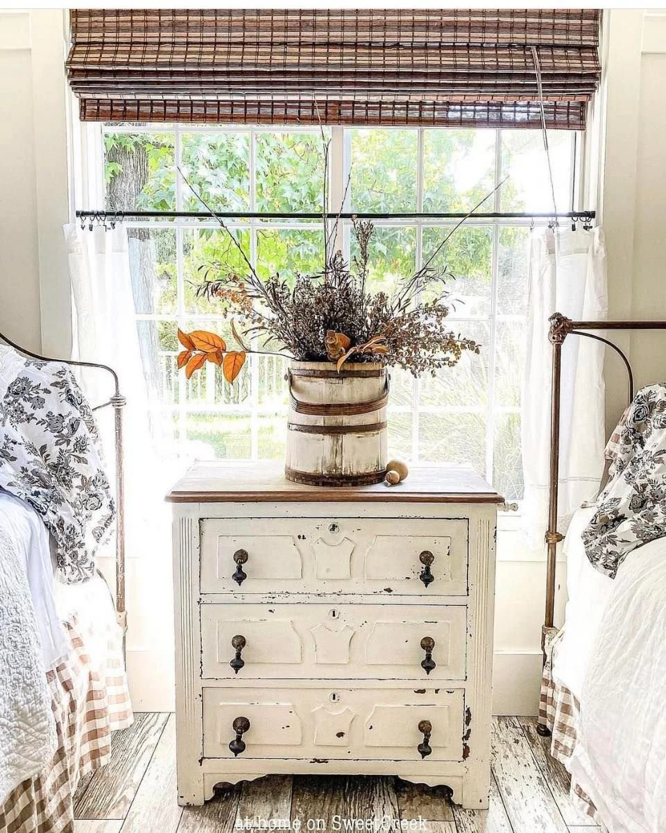At Home on SweetCreek added the distressed look to this dresser. We love the use of a dresser between two beds as a nightstand. The distressing on this dresser pairs beautifully with the antique bed frames.