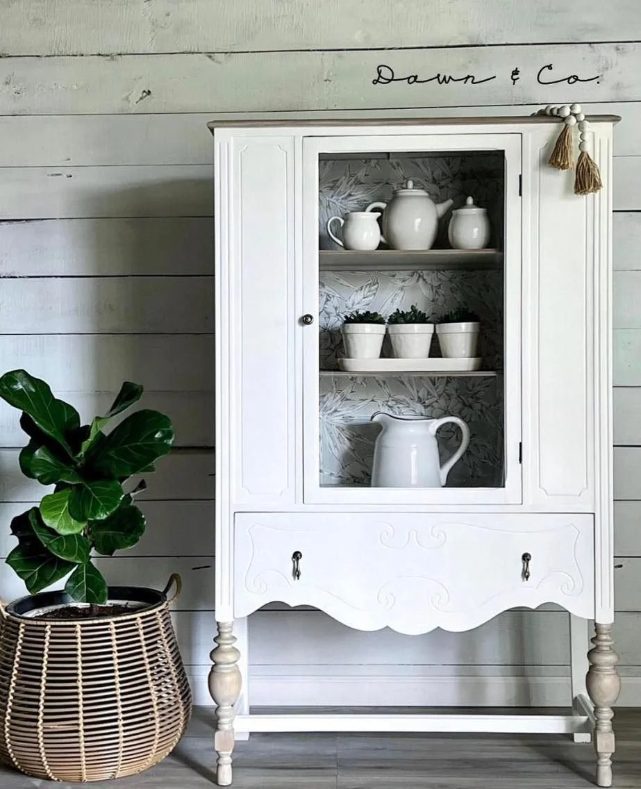 Dawn & Co refinished this armoire with Ironstone. We love the look of this armoire with the antique pulls, wood tones, and Ironstone stoneware. Notice the pattern on the interior of the armoire, Ironstone can be paired with wallpaper or painted patterns to add interest to any furniture piece.
