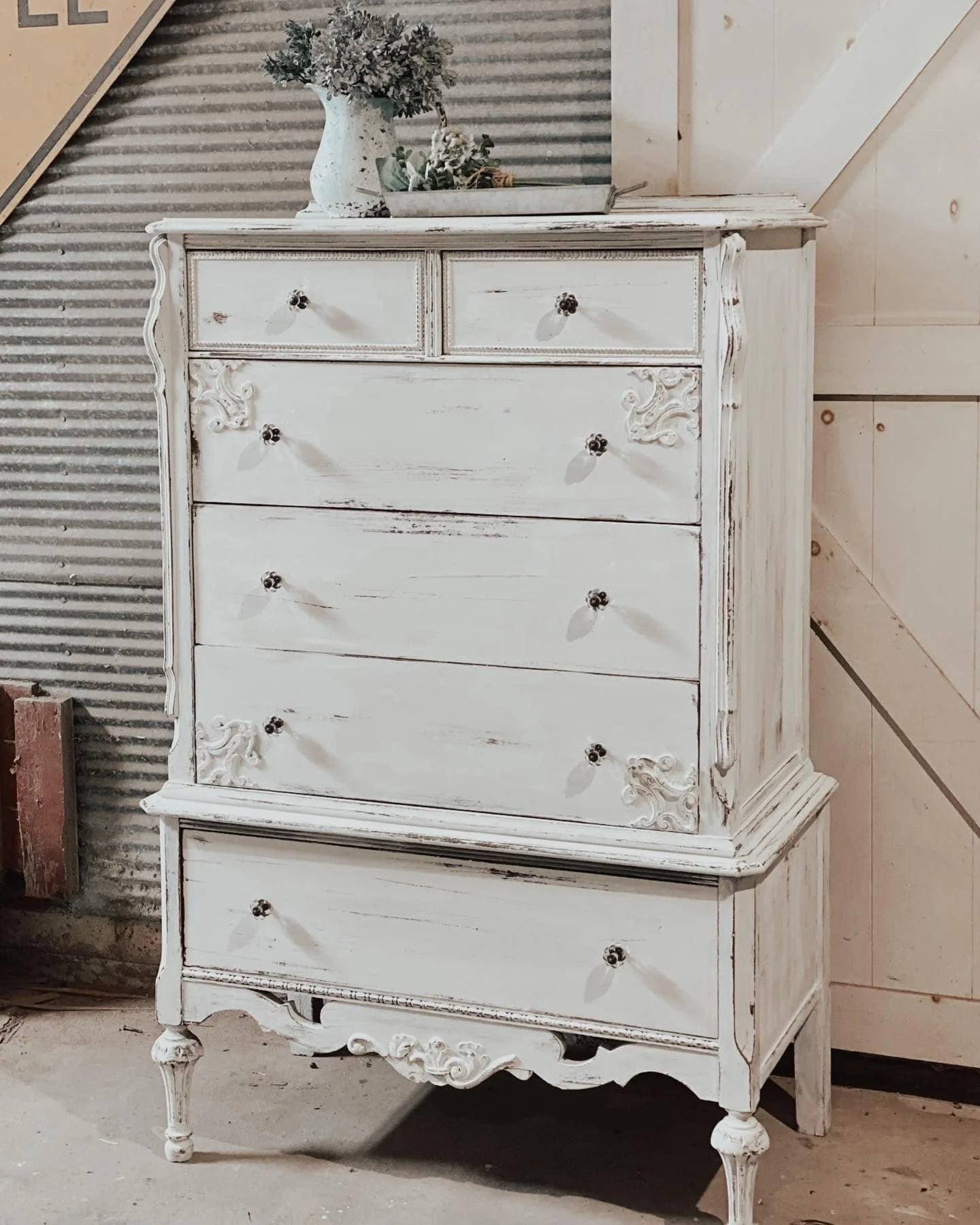 An easy way to achieve an antique look is by distressing your piece and using a chippy technique. This piece by Morgan Ann Adams from Revivals Furniture Co. is a beautiful example.