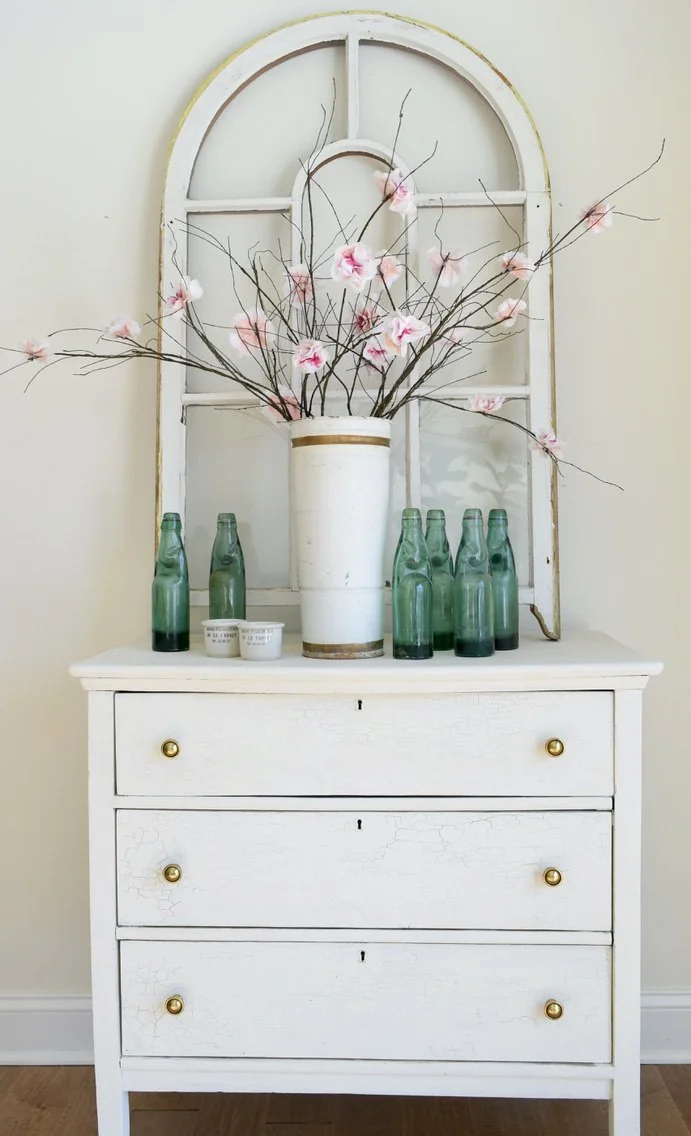 We love seeing furniture pieces refreshed with Ironstone. This dresser was painted in Ironstone by Anna from Sky Lark House. She paired it will simple gold knobs and vintage green glass bottles.