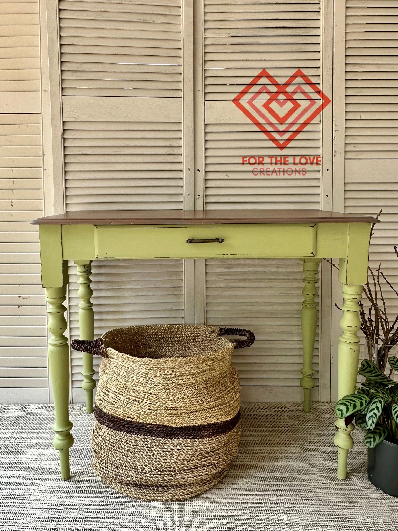 For the Love Creations created this beautiful table. The top is wood, and the legs and drawer are painted in Lucketts Green. The distressing on this piece makes the top coordinate so well!