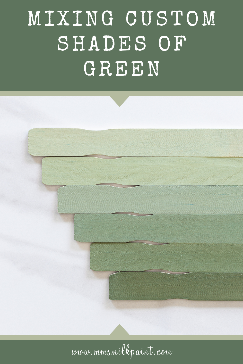 It’s worth mentioning that your custom blends of green may look a bit different than ours. There are lots of factors that can impact how our colors look from one project to another. This is why we recommend you test your custom mixes on a scrap project to make sure you like them. Wooden paint stir sticks are great for this!