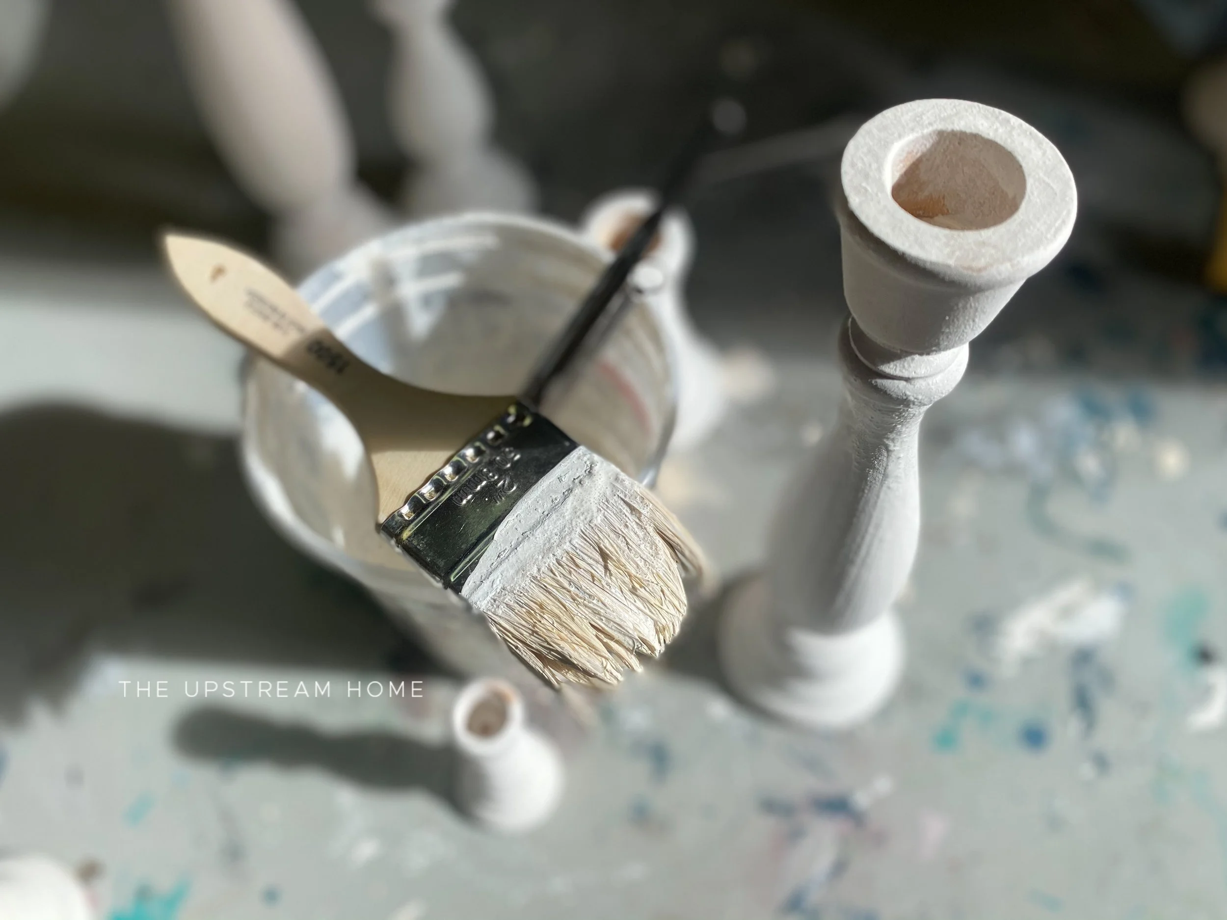 Using a 2 inch chip brush, start painting the candlesticks at the bottom and work your way up to the top. I found this direction was easiest for handling the candlestick while the paint was wet. For the very top where you would insert the candlestick, I recommend grabbing a pointed artist brush. This will allow you to carefully and quickly paint the smaller indented area.