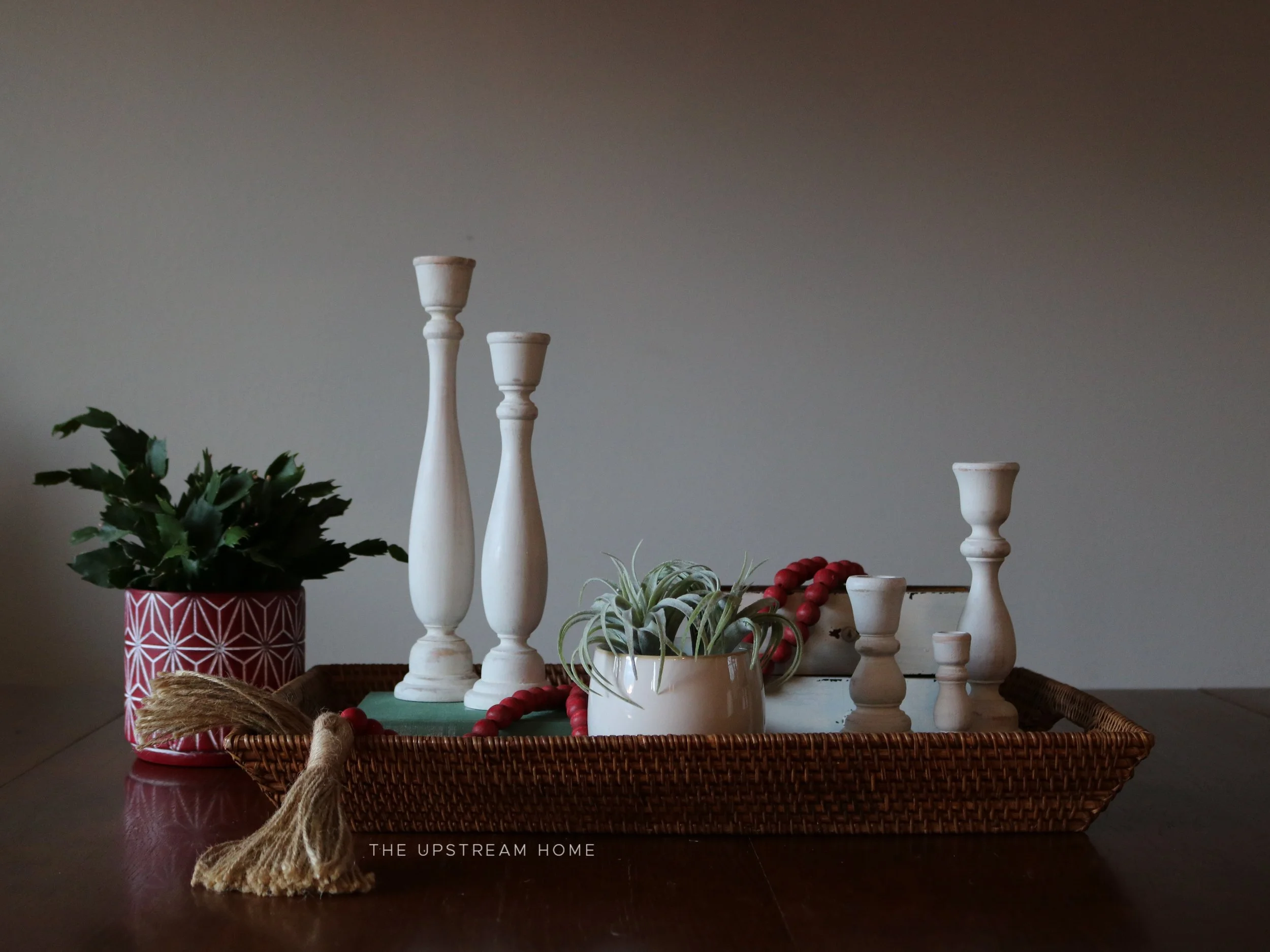 I built my centerpiece in a woven serving tray. The texture is a lovely touch, and the handles on each side make it portable! Air plants and a Christmas cactus were placed in ceramic containers with varying patterns and colors. To add height, I stacked some of the taller candlesticks on a pile of books.