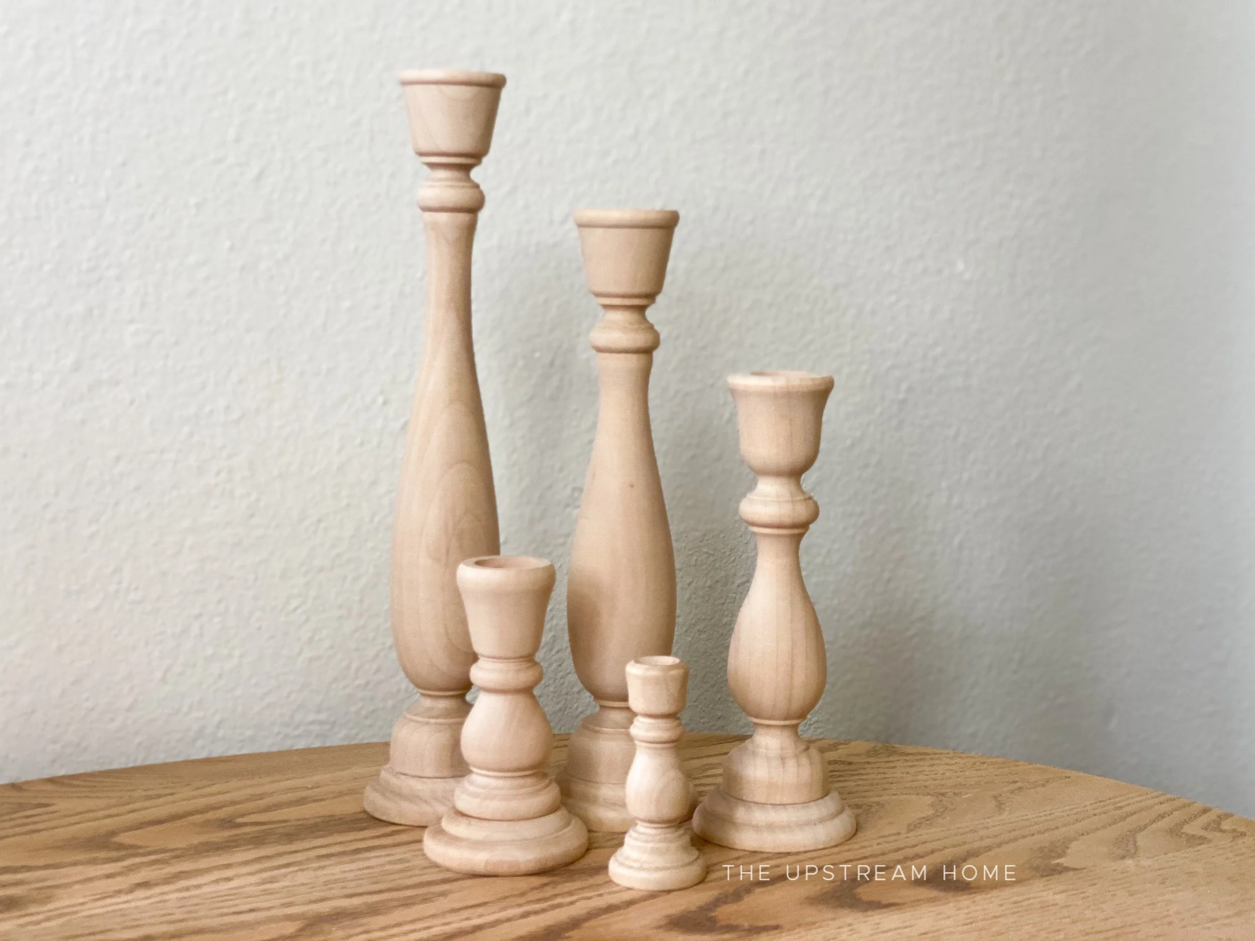5 wooden candlesticks of varying height. (You can find these in your local craft store or online)