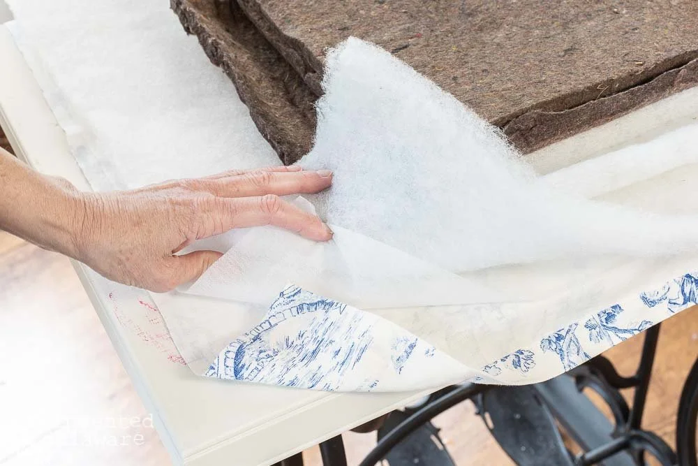 Also, notice all of the layers allow for plenty of room to cover the stool with leftovers. Don’t cut yourself short by not allowing enough fabric and batting!