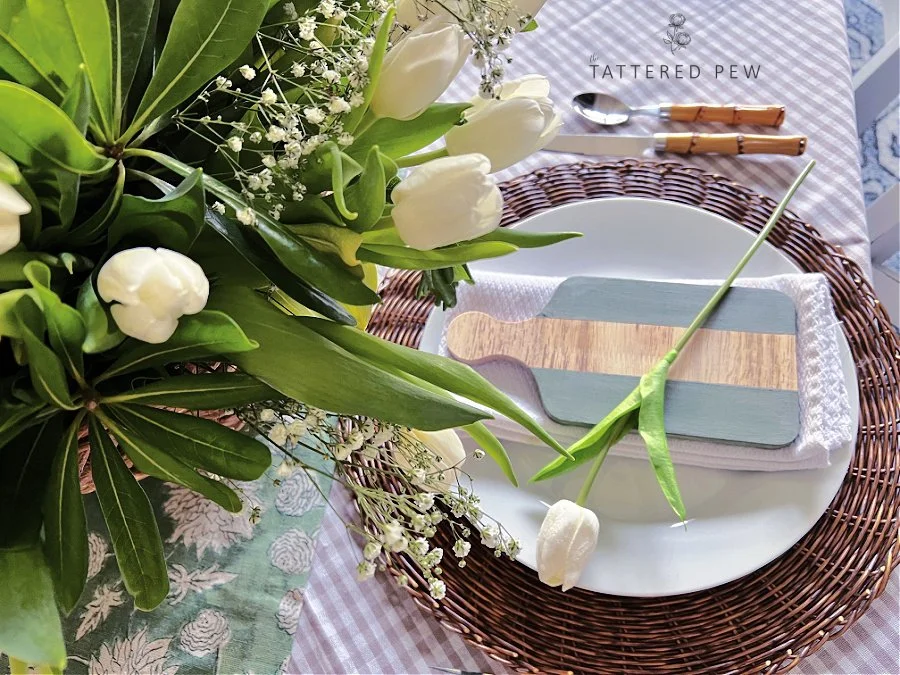 I had fun styling them on my Spring dining room table. They fit perfectly on top of my plate and napkin for a lovely layered look. Wouldn't it be so cute to set a place card on top of the board with a guest's name on it?