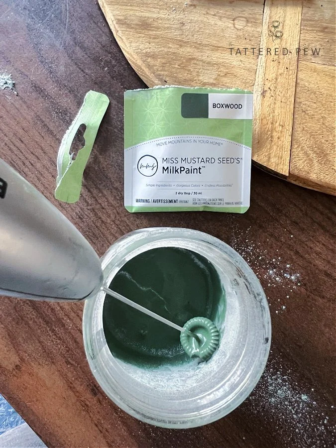 Mix equal parts water to equal parts paint. I added the water to my glass jar (2 tbsp) and then added the same amount of paint. When using milk paint, it is important to start with the water first and then add your paint. I used my mini hand mixer to make sure it was completely mixed together.