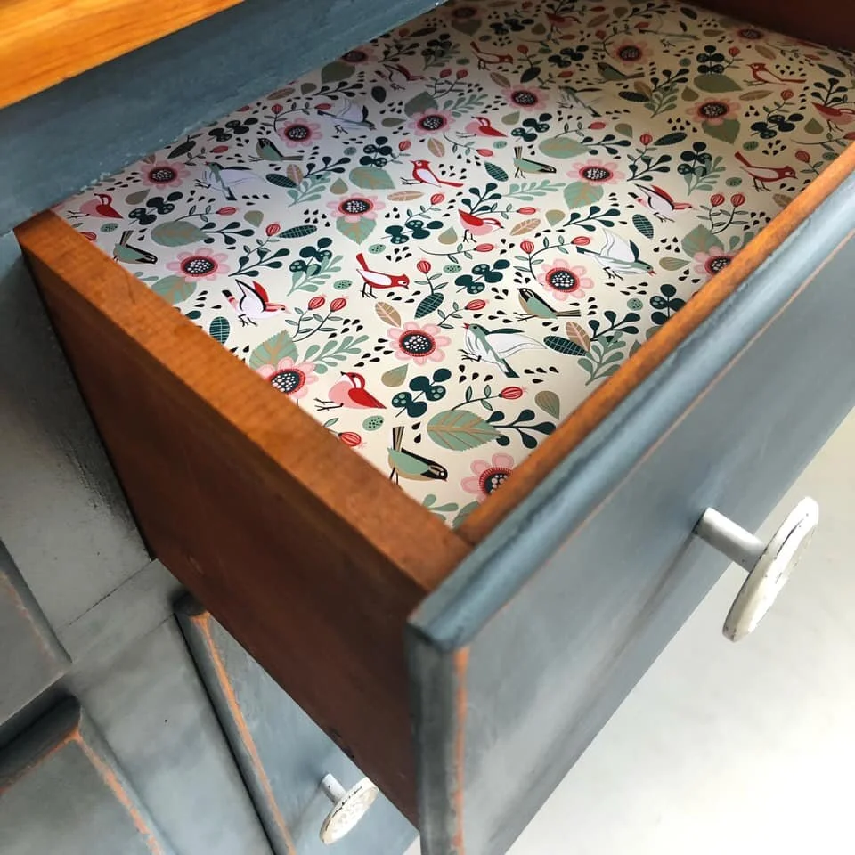 For an extra special touch, Julie lined the drawers of her hutch with a whimsically patterned paper.
