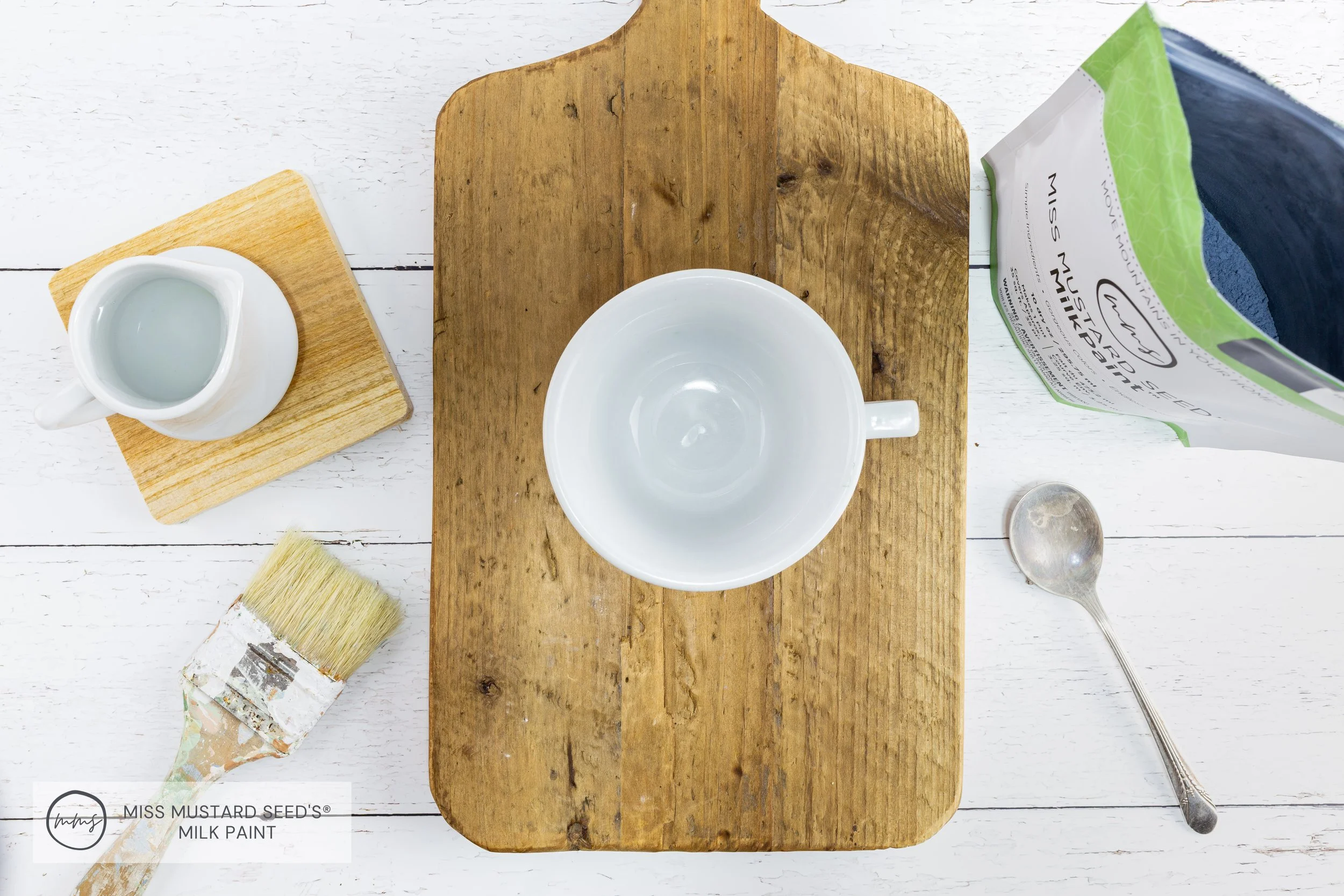 Grab your chosen color of MilkPaint™ and open up the pouch. We’re using Ink Blue (formally named Artissimo). This is a rich and moody shade of blue, reminiscent of ink flowing out from an old fashioned fountain pen.