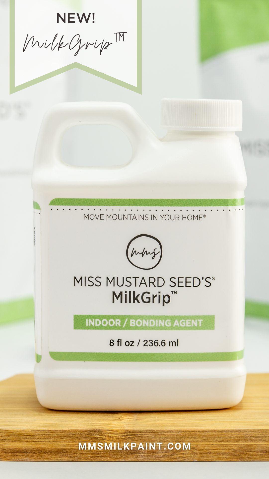 MilkGrip™ is a water-based concentrated acrylic emulsion that increases the adhesive properties of mixed Miss Mustard Seed’s MilkPaint™.
