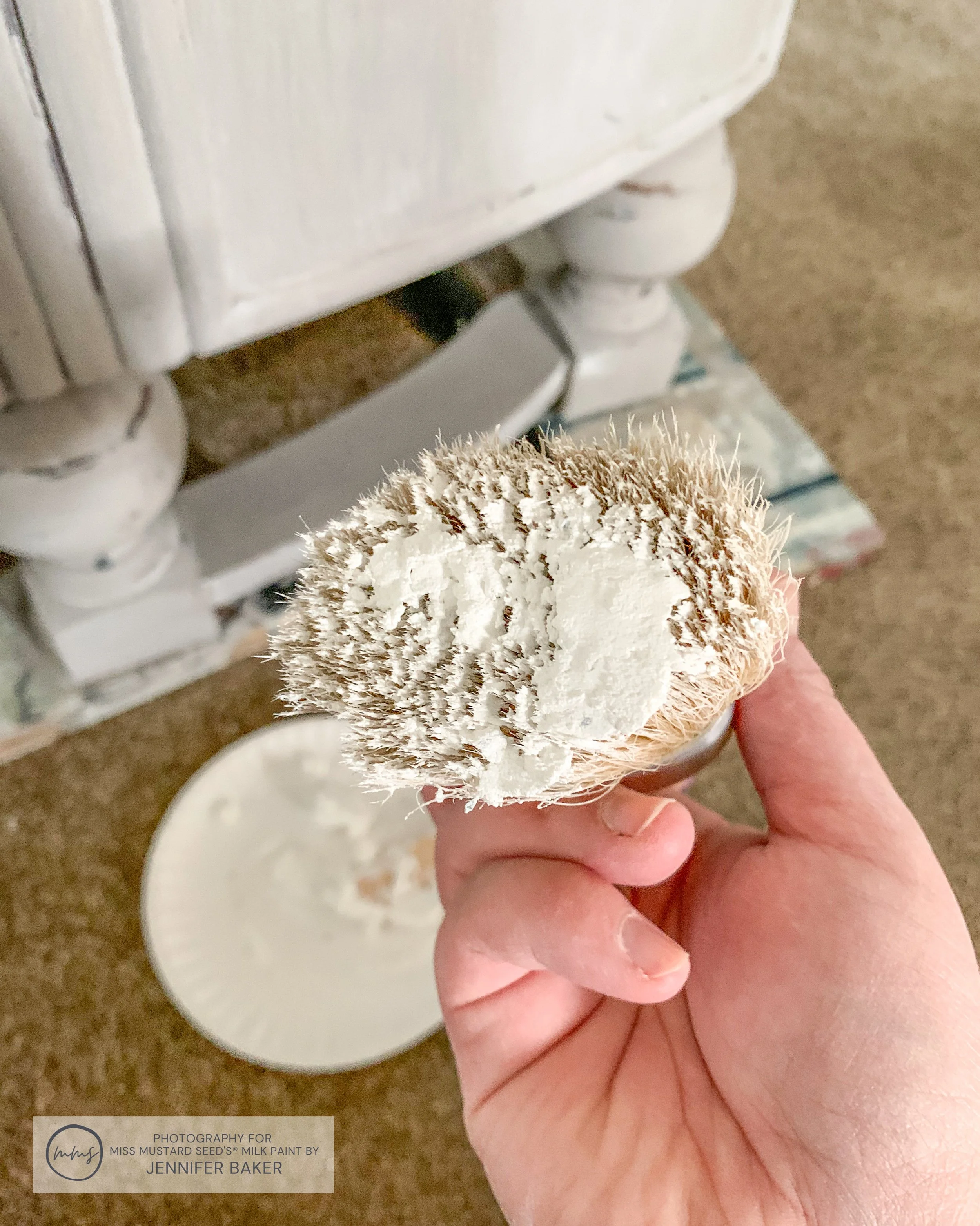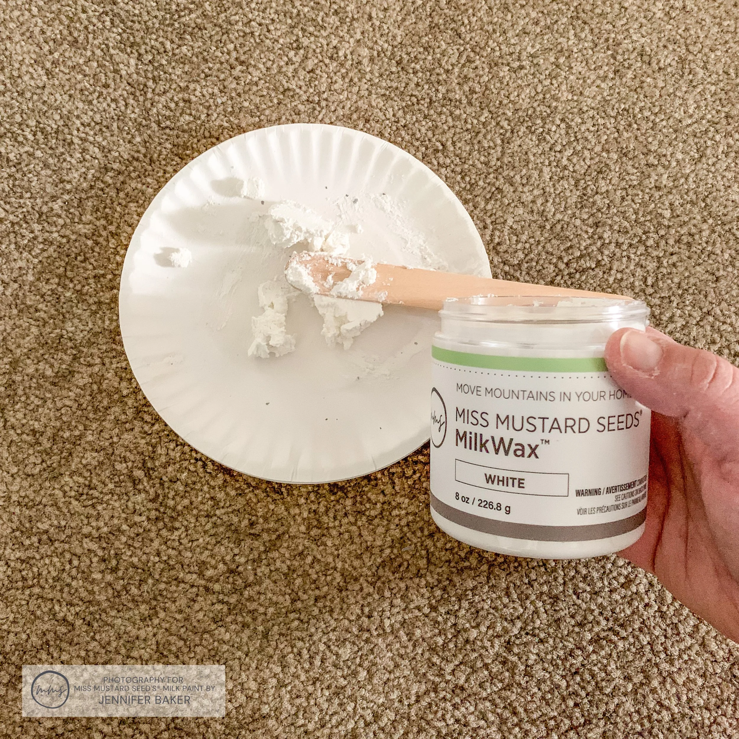 Once everything was all sanded and dusted off, I got my jar of MilkWax™ - White off the shelf. Using a popsicle stick, I scooped out a little bit and placed it on a paper plate. That’s where I worked from - not the jar itself. By keeping my brush out of the jar, it stops the “good” wax from getting contaminated.
