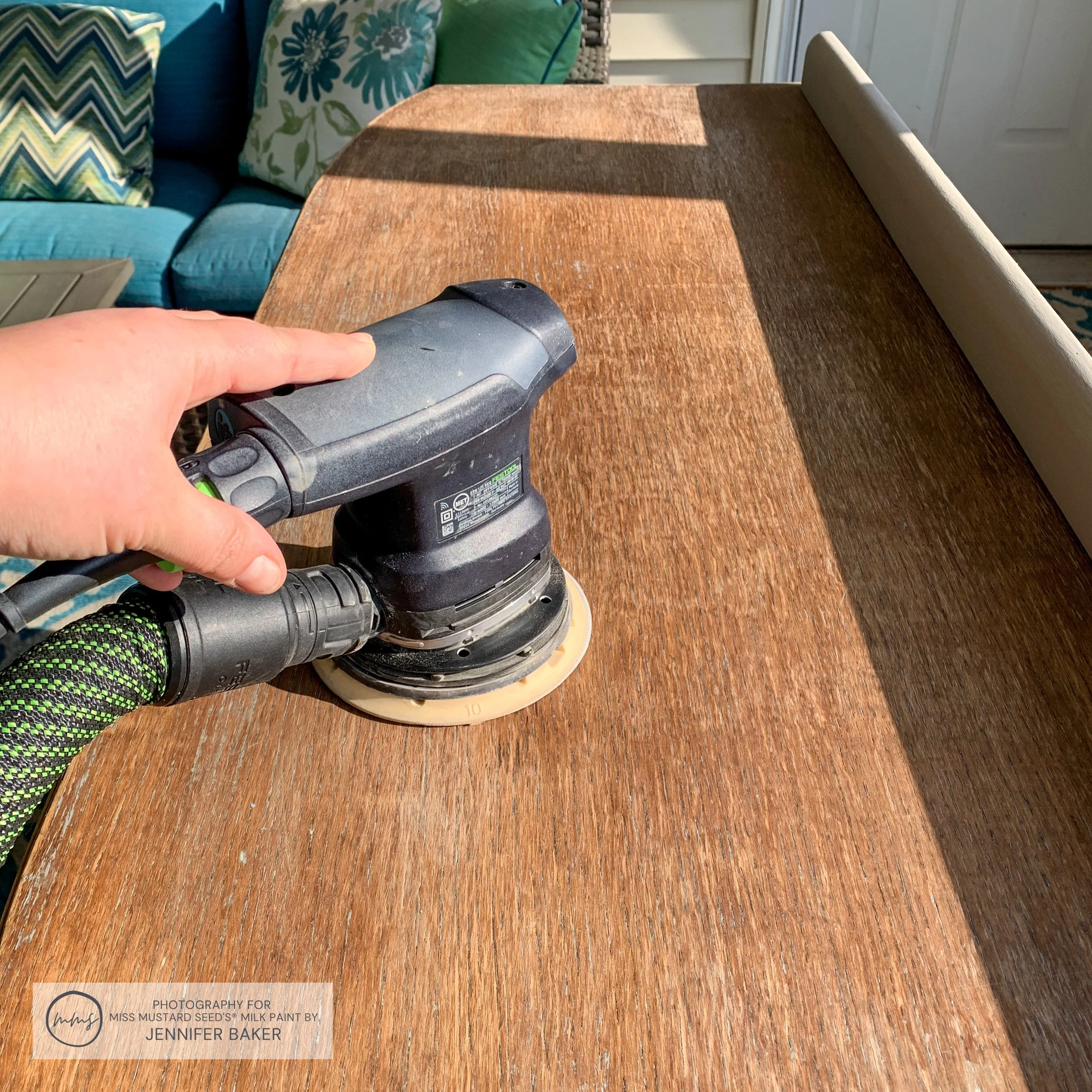 Using my Festool sander, I took my time and followed a sanding schedule of 80 grit, 120 grit then 150 grit. Gradually increasing the softness of your grit helps to avoid swirl marks.