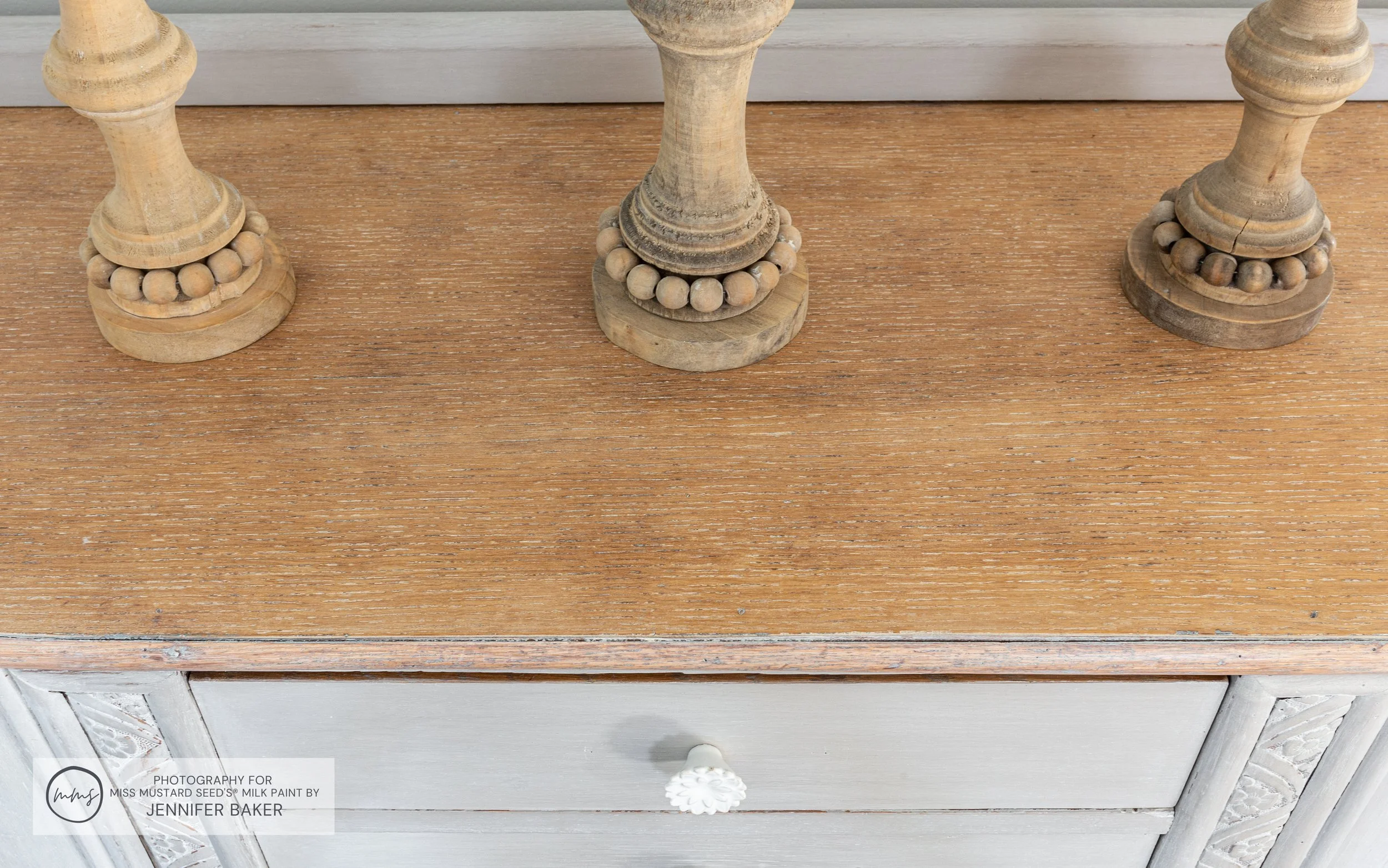 Once the buffet body was painted, I turned my attention to the top. My vision was to sand off the original finish and whitewash the top using MilkWax™ - White.