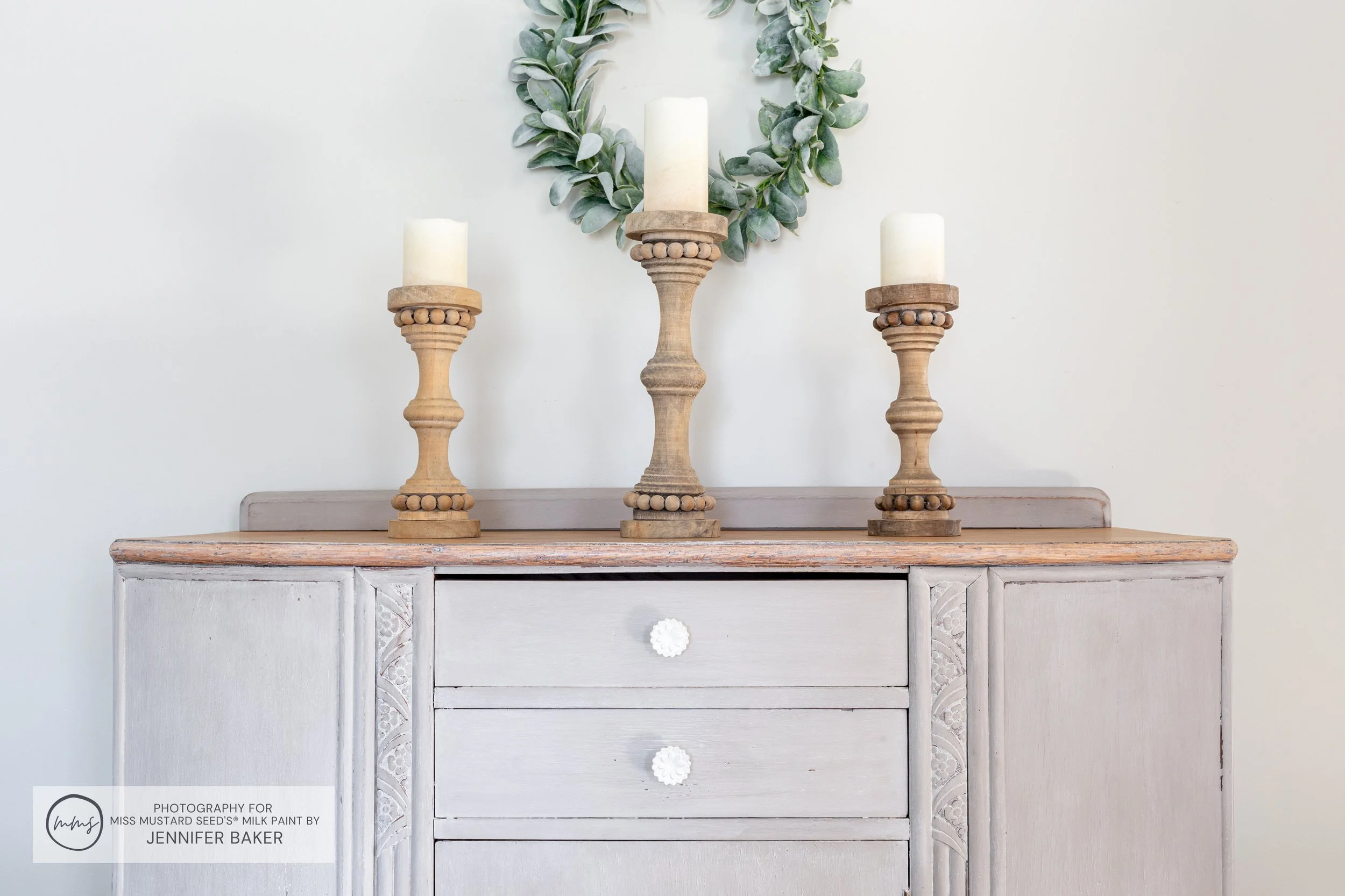 I’m filling my studio with calm and soothing colors like sage green, whispers of blue, natural wood, sandy tans and whites. Thanks to MilkPaint™, my buffet finally fits in! That intense orangey finish is gone, leaving behind a soft, airy and soothing new look.