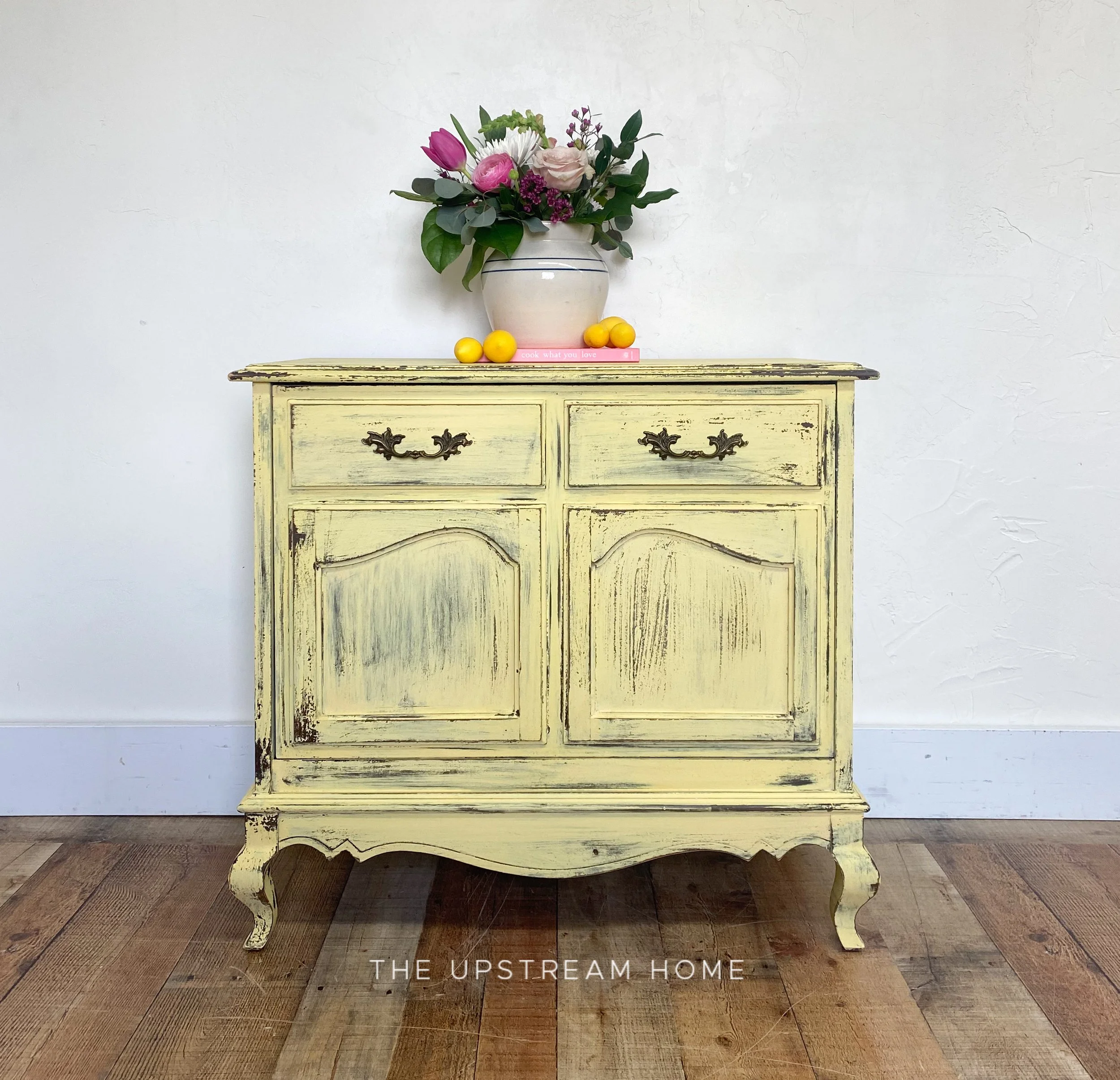 We love the look of distressed Sunkissed pieces! This cabinet was refinished by the Upstream Home. It looks charming paired with spring florals and lemons.