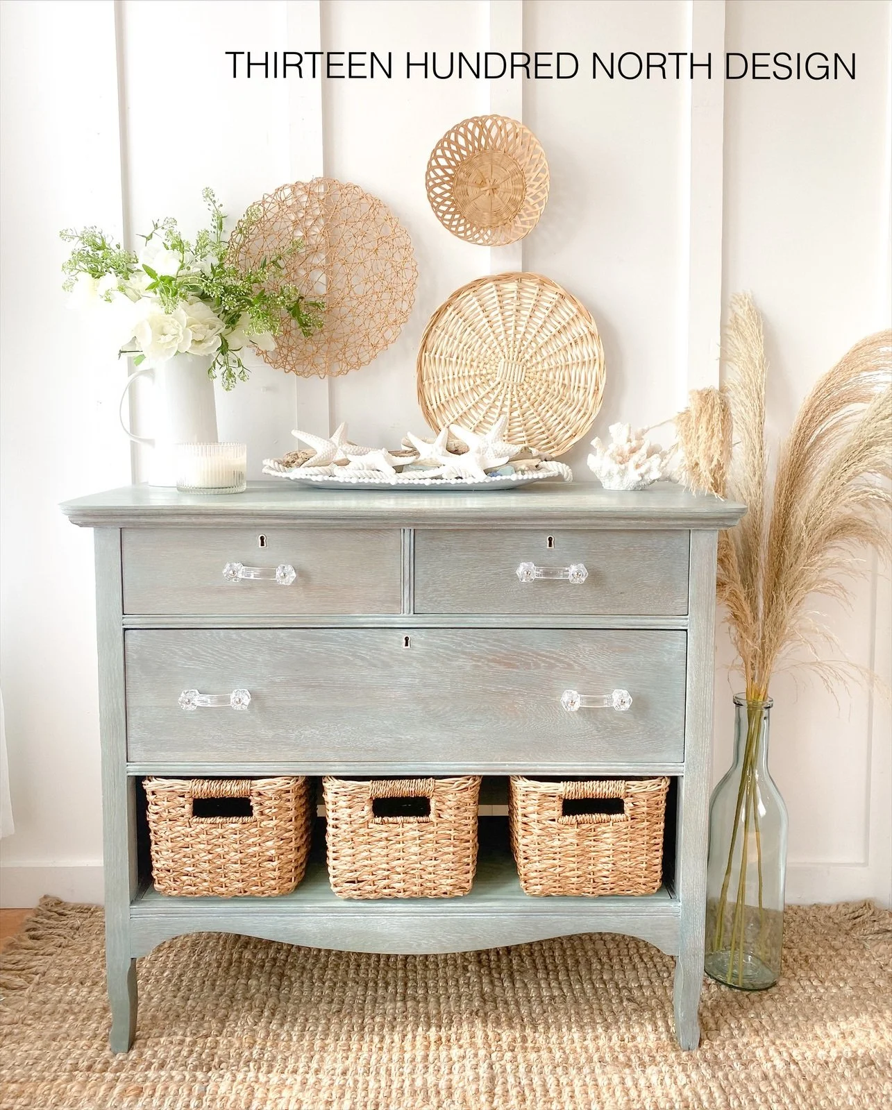 Nicole of Thirteen Hundred North wrote a tutorial here on our blog detailing how she got this perfectly coastal Teal Ocean washed finish on this antique dresser.