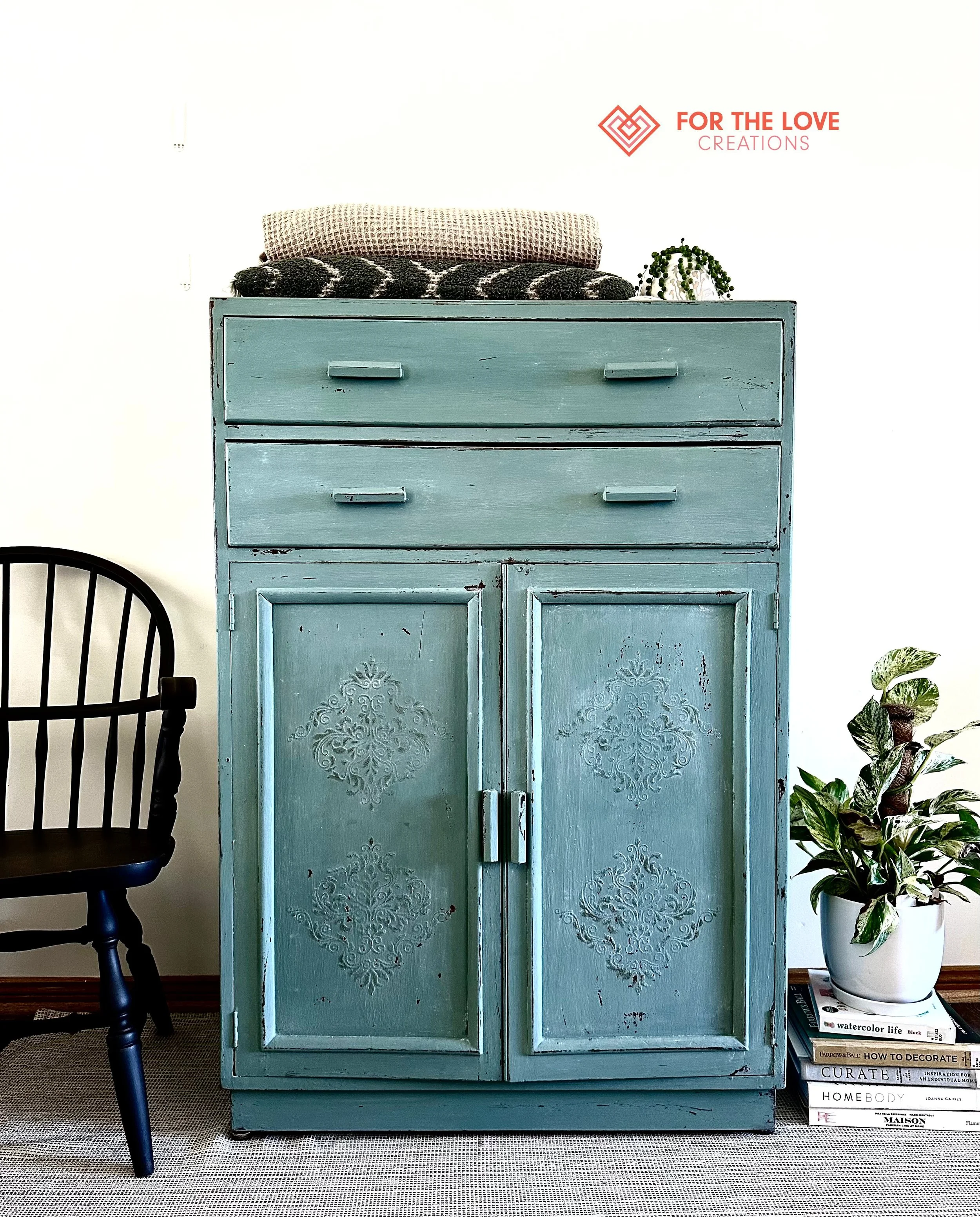 We love the look of distressed Teal Ocean pieces! The Upstream Home refinished this cabinet. It looks perfectly rustic with a white-washed top and drawer.