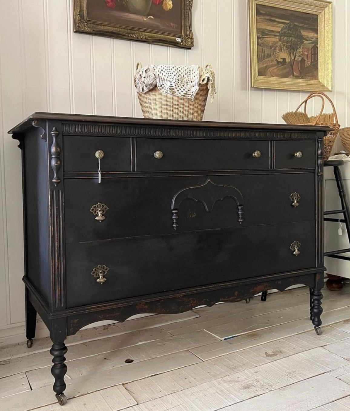 We can never get enough of Typewriter, so we were thrilled to see this bedroom set-up using our soft black! Vintage 61 Storehouse created this timeless look by painting the entire bedroom set in Typewriter and decorating it with black and white elements. It is timeless!