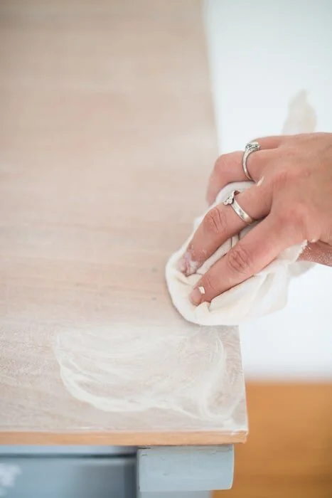 Miss Mustard Seed’s White Wax is very easy to apply over raw wood to achieve a whitewashed look. Simply rub on with a microfiber cloth or a wax brush (my favorite technique).