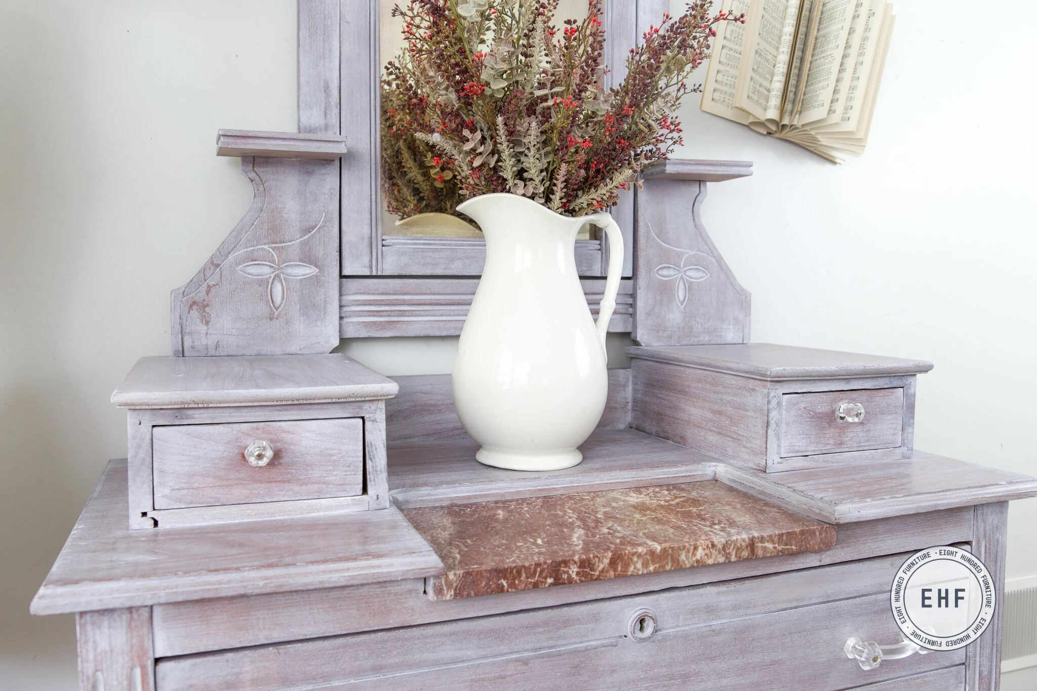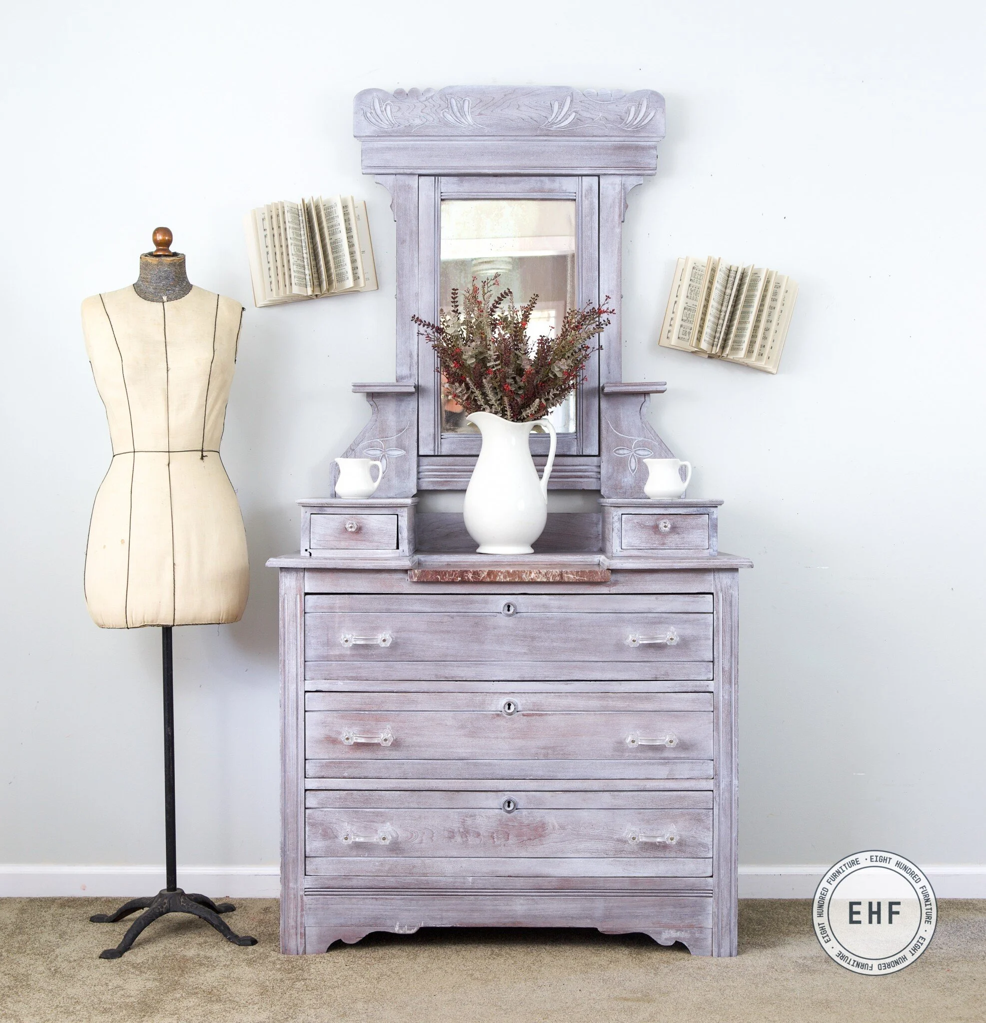 It was the perfect design choice for this gorgeous Eastlake style dresser with mirror and glove boxes.